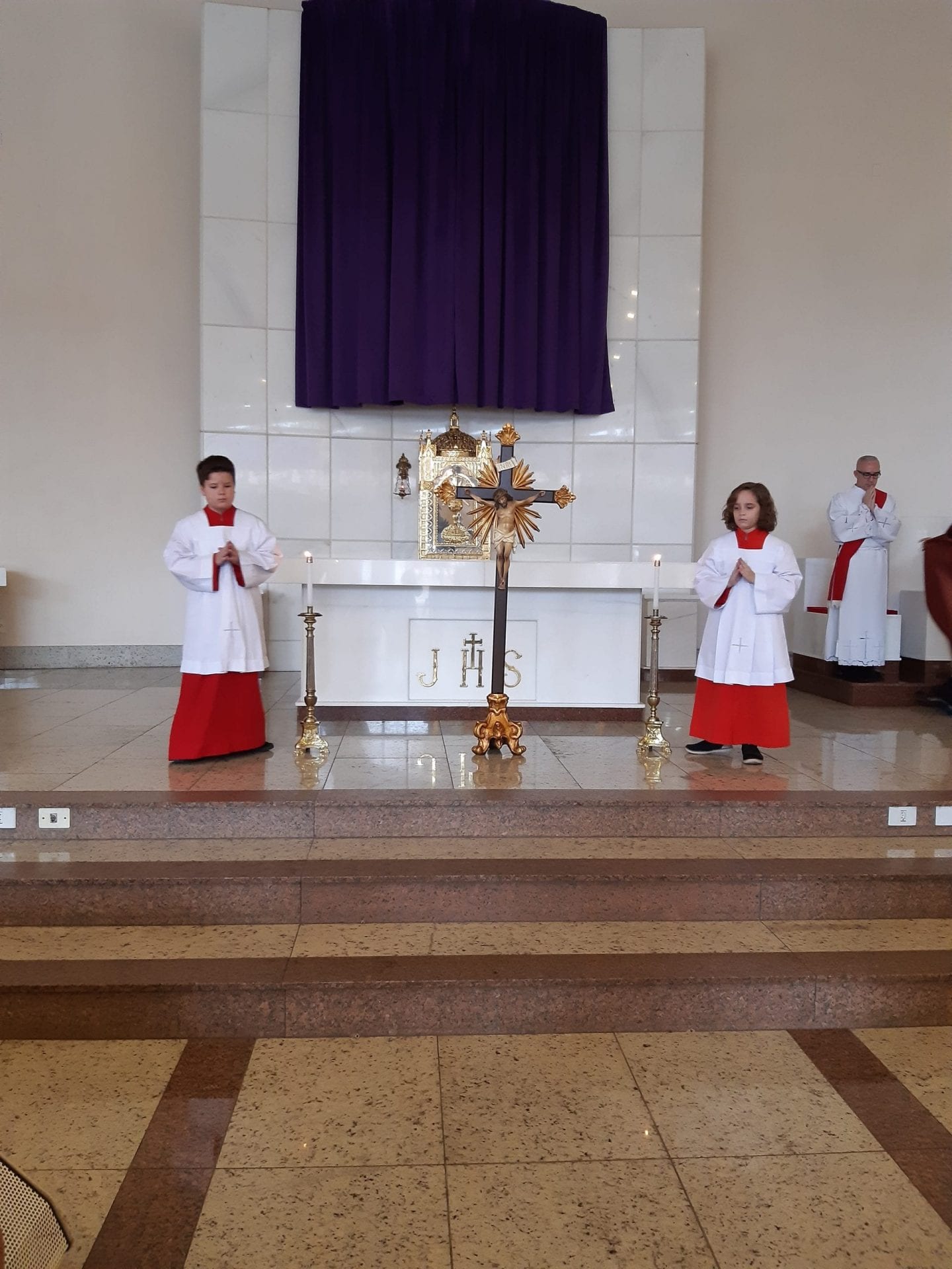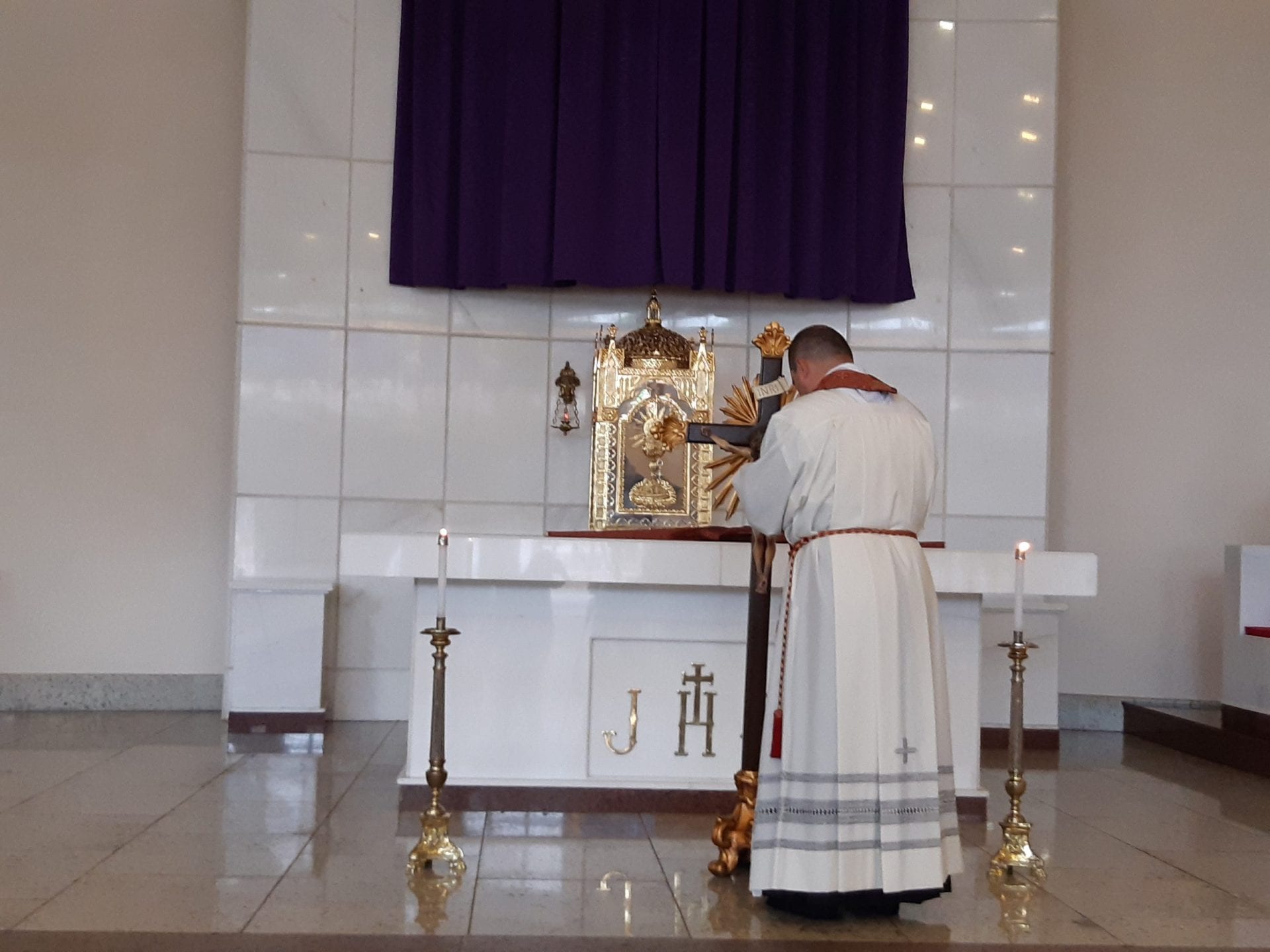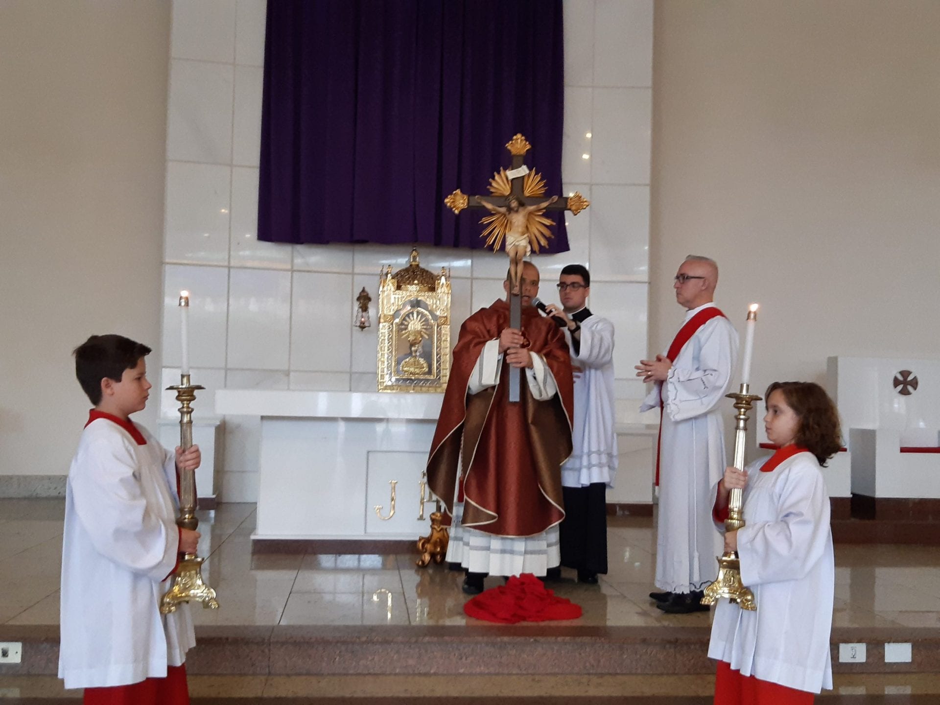 Com muita piedade e silêncio, foi realizada às 15 horas em nosso Santuário Senhor do Bonfim, na Sexta-feira da Paixão, 10 de abril, a Ação Litúrgica da paixão e morte do Senhor, uma celebração que é dividida em três partes: a leitura da Sagrada Escritura e a oração universal, a adoração da Santa Cruz e por fim, a Comunhão Eucarística. Neste dia, no mundo inteiro, não se celebra Missa, há somente a Ação Litúrgica, porque nesse dia o sacerdote é o próprio Jesus Cristo que se doou por nós.