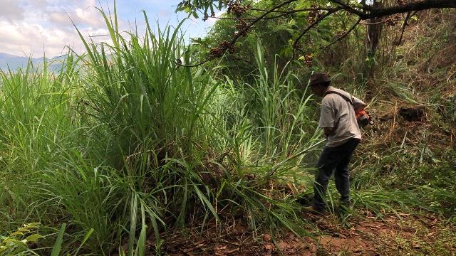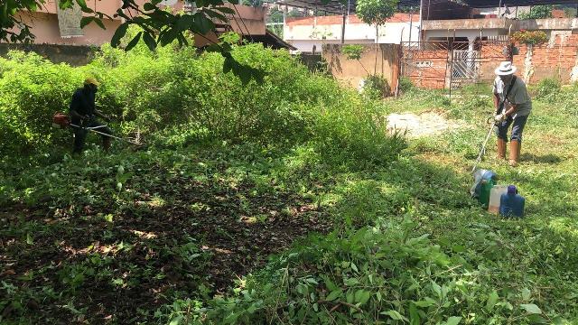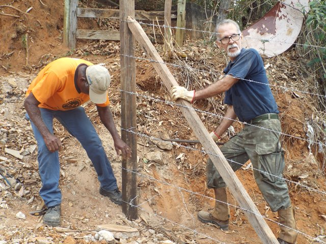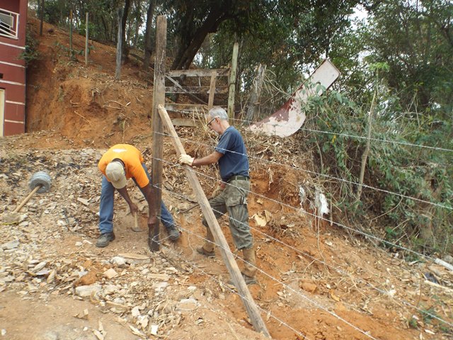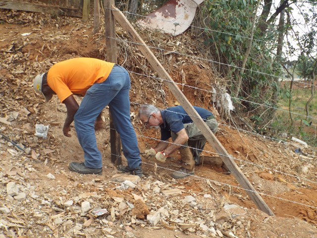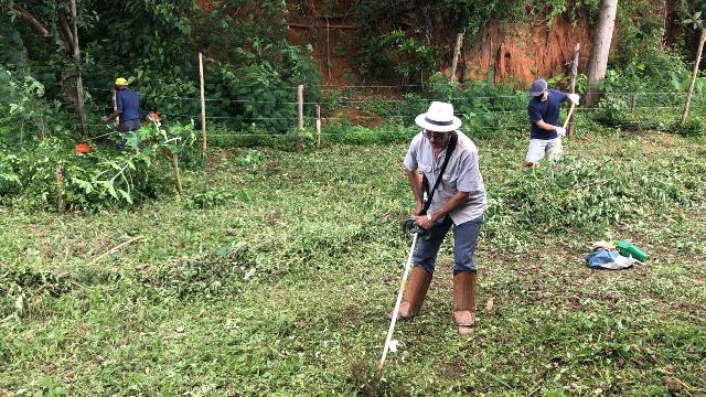 A primeira ação realizada foi refazer e fortalecer o cercamento para impedir entrada de animais e dificultar deposito de lixo no local. Feito isso, foi feita a limpeza do local utilizando roçadeira, enxadas e foices. Todo mato foi separado e utilizado como composto orgânico e o entulho retirado pela contratada da Prefeitura Municipal.