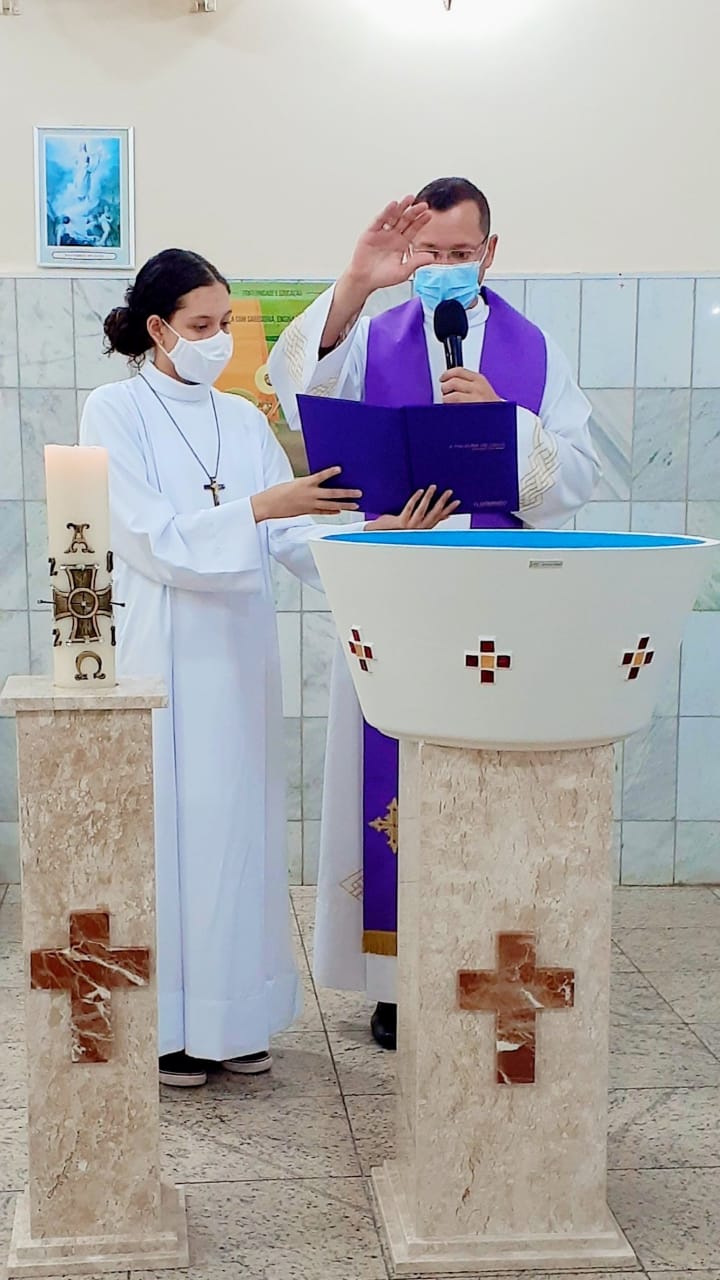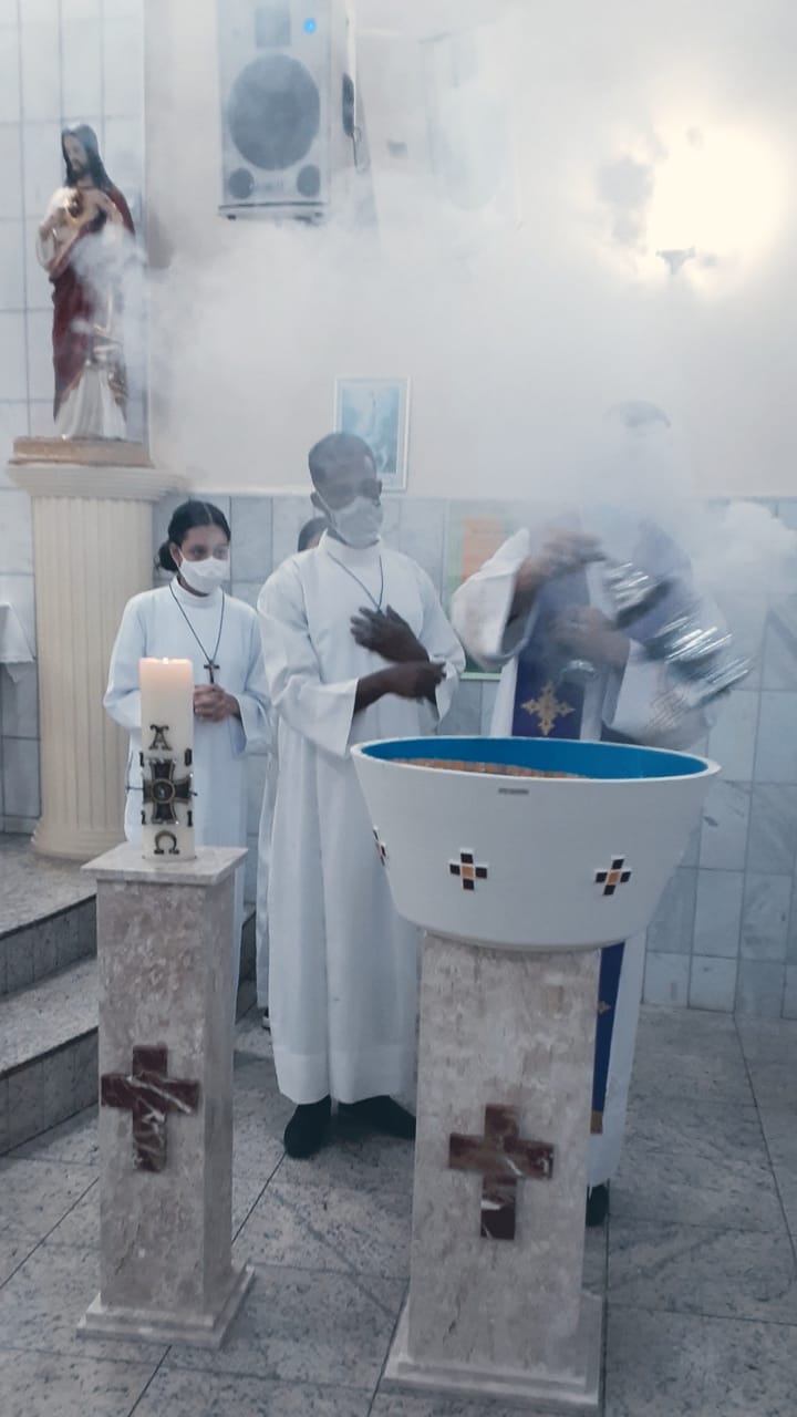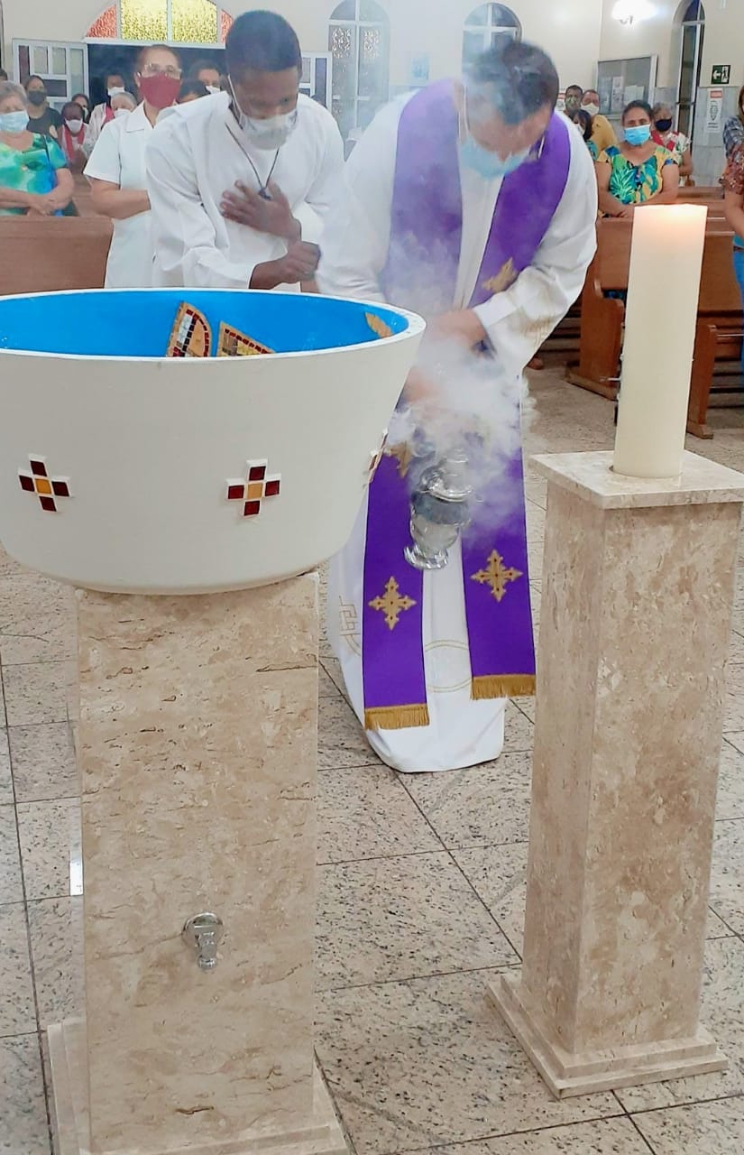 O rito de bênção, realizado após a comunhão eucarística, foi composto do acendimento do círio, oração de bênção, incensação do círio e da pia e aspersão de todo o povo de Deus.