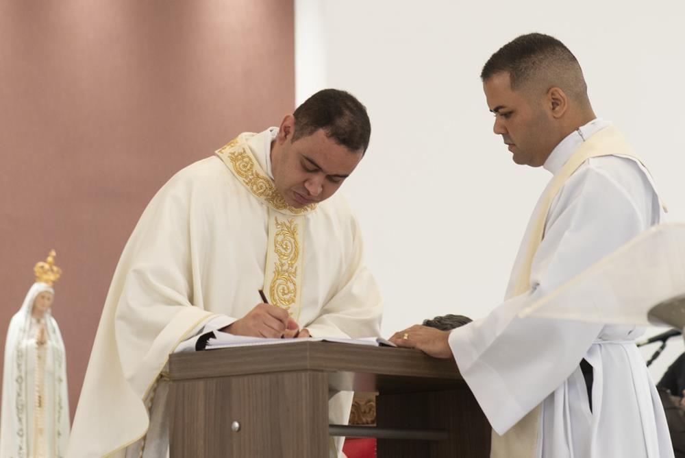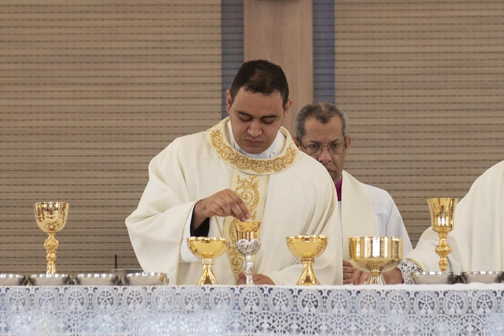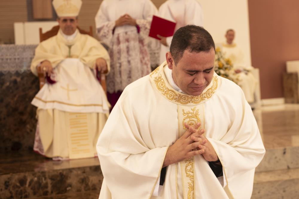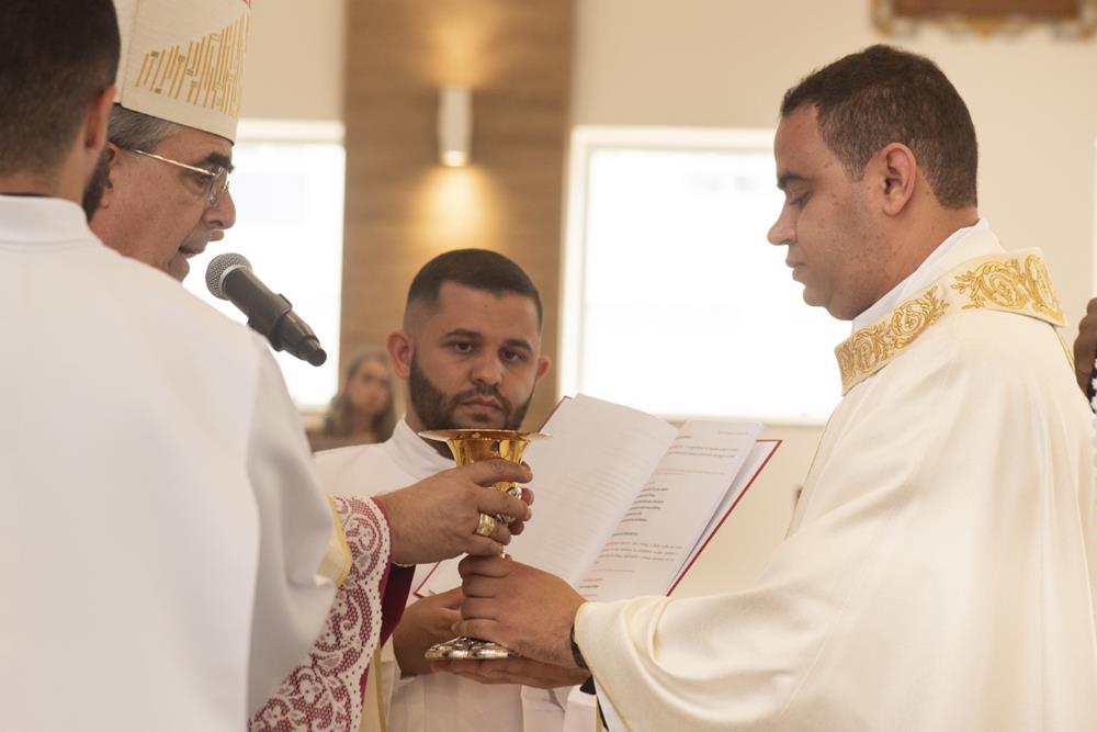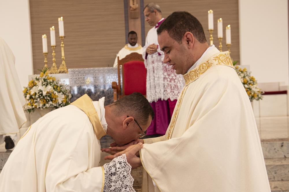 Após a homilia, seguindo o rito da ordenação, foi feito o propósito do eleito e a Ladainha de Todos os Santos quando o eleito ao sacerdócio se prostrou com o rosto em terra ‘simbolizando a morte para este mundo e a ressurreição em Cristo para uma nova vida’. Na sequência, Dom Marco Aurélio impôs as mãos sobre o eleito, gesto que foi também realizado por Dom Odilon Guimarães Moreira, bispo emérito, e padres presentes. Após a oração consecratória, o neo-presbítero foi revestido das Vestes Sagradas – a estola e a casula. Tendo as mãos ungidas com o óleo do Crisma e cingidas com uma faixa pelo bispo e desatada pela sua mãe, concedeu a primeira benção sacerdotal aos seus pais. O bispo diocesano entregou ao neo-prebítero os dons do pão e do vinho, na patena e no cálice, dizendo: “Recebe a oferenda do povo santo para a apresentares a Deus. Toma consciência do que virás a fazer; imita o que virás a realizar, e conforma a tua vida com o mistério da cruz do Senhor.” A acolhida ao presbitério foi feita com o ósculo nas mãos ungidas do neo-sacerdote e o abraço do bispo, seguido pelos demais sacerdotes e a manifestação do Povo de Deus também acolhendo o neo-Sacerdote.