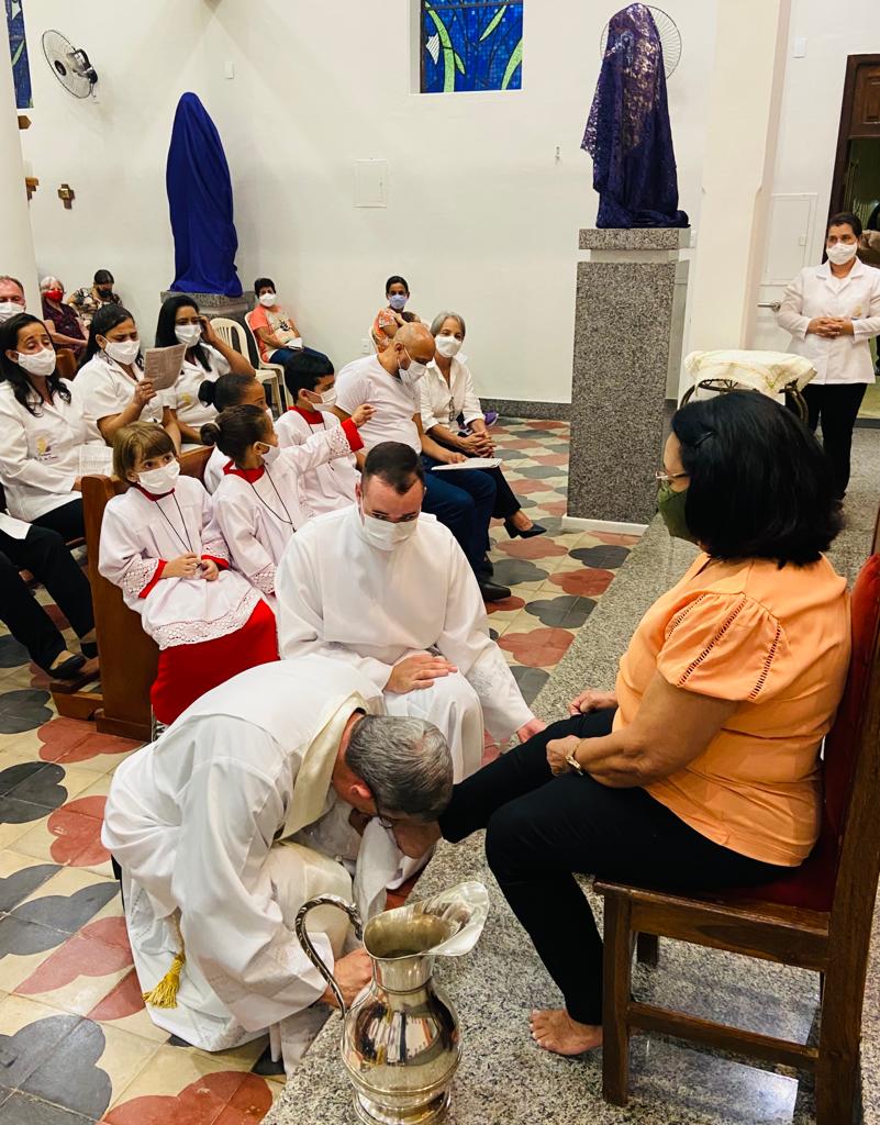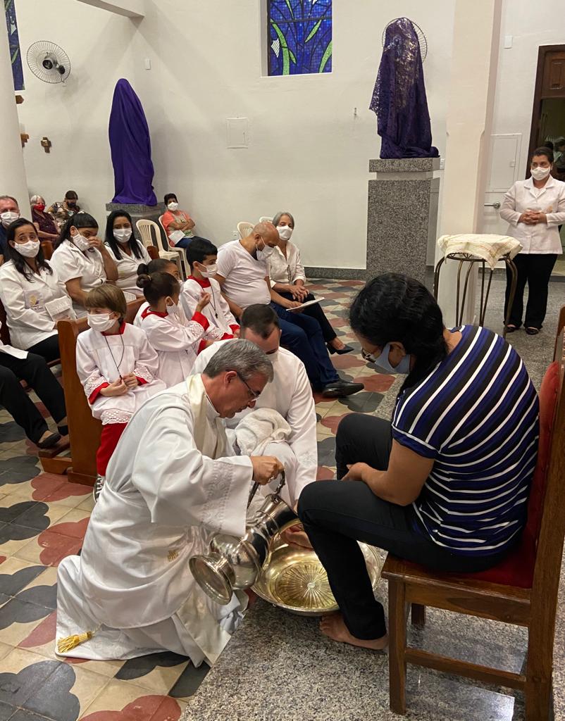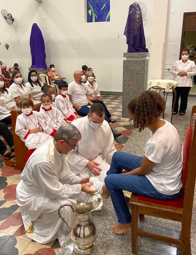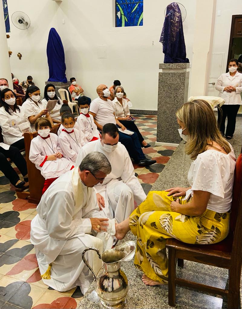 Após a homilia, Dom Marco Aurélio lavou os pés de professores, funcionários e alunos da Escola Estadual Antônio Martins Pereira, fazendo memória da Campanha da Fraternidade de 2022: “Fraternidade e educação”. A celebração Eucarística contou com expressiva participação da comunidade local e foi concelebrada por Pe. Adriano Mendes de Pinho, administrador da referida Paróquia. Nesta mesma celebração o casal João Carlos e Nicole apresentaram para comunidade os Santos Óleos que foram abençoados na missa da Unidade realizada na Catedral Diocesana de Itabira.