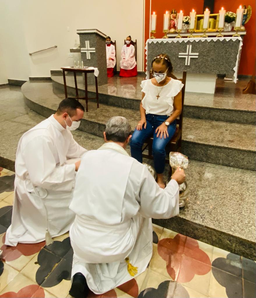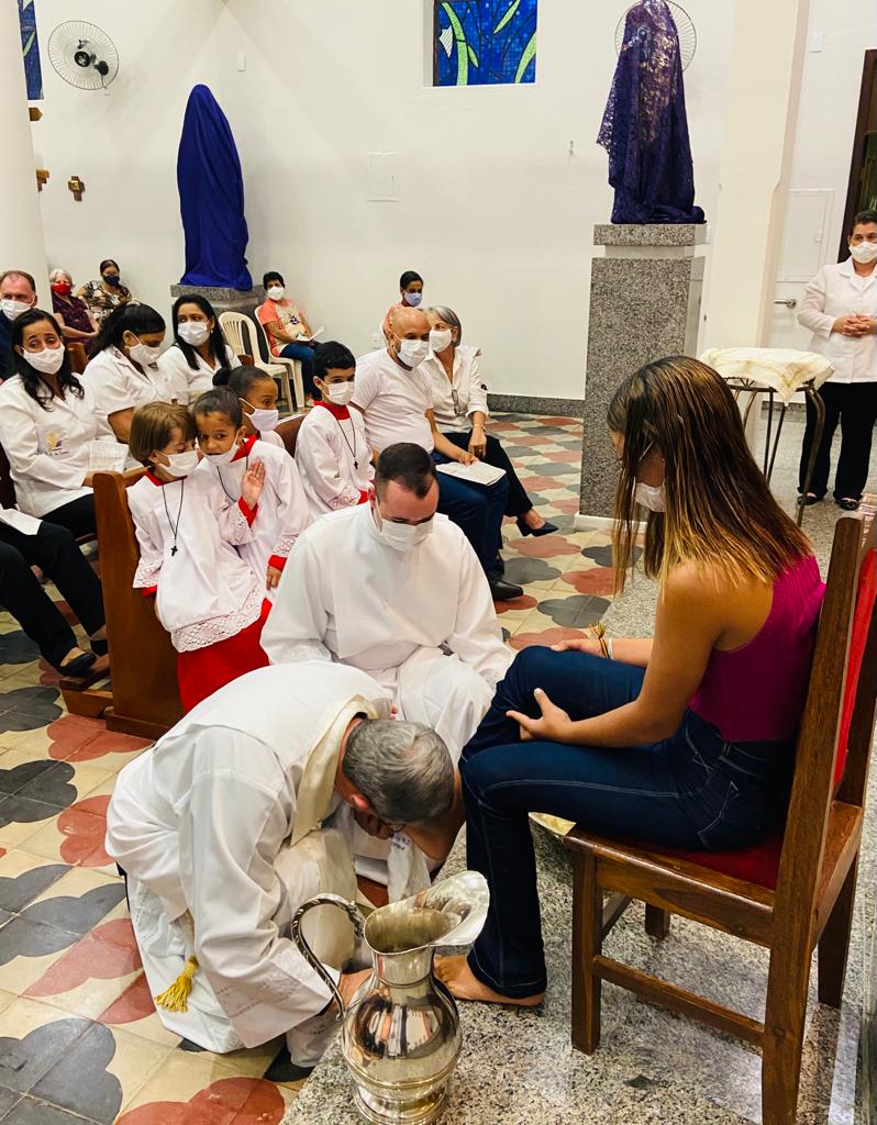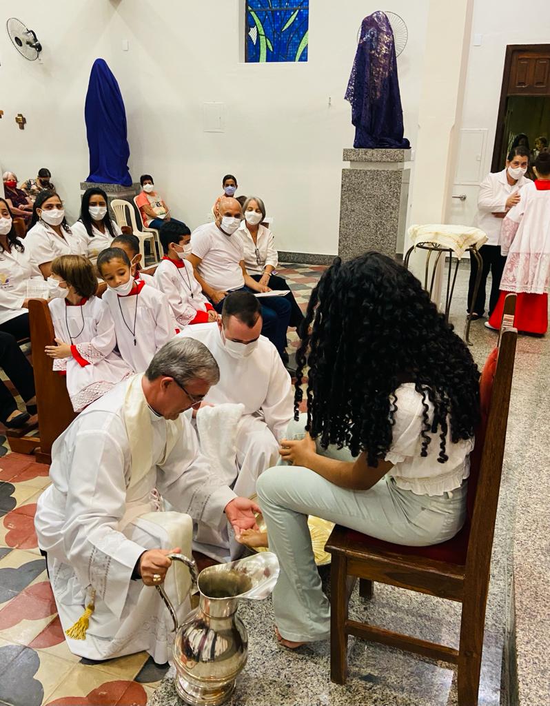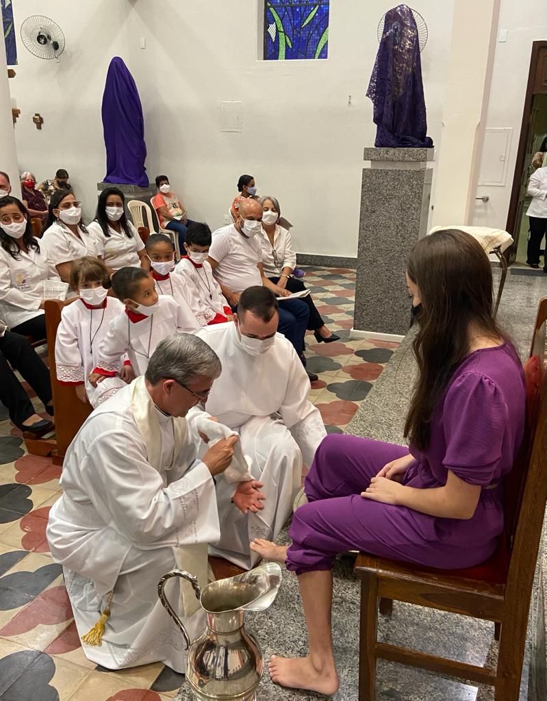 Após a homilia, Dom Marco Aurélio lavou os pés de professores, funcionários e alunos da Escola Estadual Antônio Martins Pereira, fazendo memória da Campanha da Fraternidade de 2022: “Fraternidade e educação”. A celebração Eucarística contou com expressiva participação da comunidade local e foi concelebrada por Pe. Adriano Mendes de Pinho, administrador da referida Paróquia. Nesta mesma celebração o casal João Carlos e Nicole apresentaram para comunidade os Santos Óleos que foram abençoados na missa da Unidade realizada na Catedral Diocesana de Itabira.