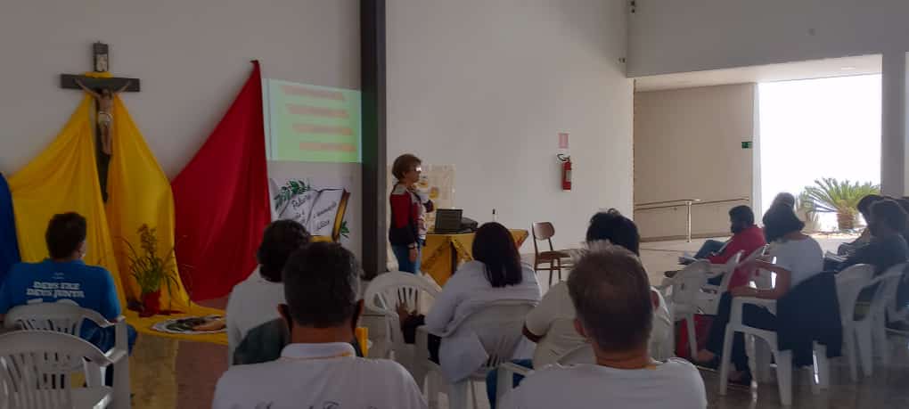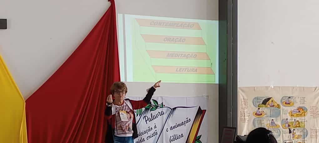 Na sequencia das atividades, Leonor Péres, da Paróquia Cristo Redentor de Ipatinga, apresentou o tema principal: “Leitura Orante da Bíblia”. Foi feito uma abordagem da história da Leitura Orante, desde a origem do cristianismo e sua retomada após o Concílio Vaticano II; retratando como este método pode nos aproximar dos textos bíblicos e contribuir com nosso encontro pessoal e comunitário com Jesus Cristo. Deu ênfase aos passos do método e realizou um momento de vivência, para que todos e todas pudessem experimentar a Leitura: 1º. Leitura: atentamente e devagar, ao ler, experimentar ouvir o texto. Destacar as palavras fortes no texto, os personagens. Pensar um pouco no contexto. Realidade da época do texto. 2º. Meditação: O que o Senhor me diz ou nos diz por esse texto? Procurar perceber o que tudo isso tem a ver com a sua, com a nossa vida cristã. 3º. Oração: O que esse texto me faz dizer a Deus: agradecimento, clamores, suplicas. Tentar rezar inspirado no texto e atualizar a oração com a realidade hoje. 4º. Contemplação: Ver a Vida com os olhos da fé para transformar o Eu, o Nós, o mundo. O que preciso transformar. Assumir um gesto concreto.