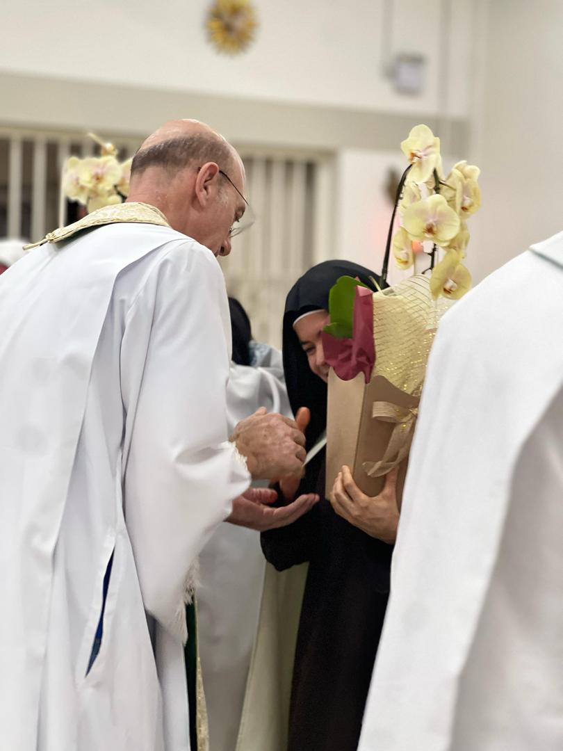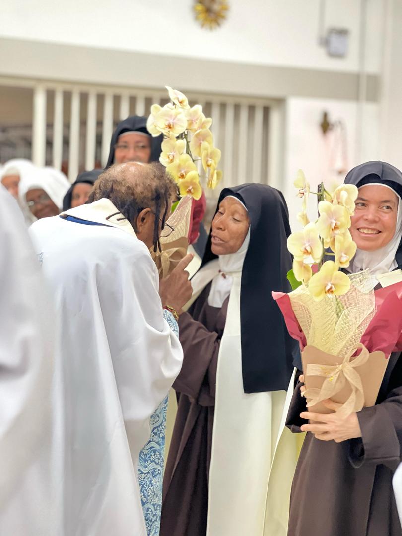 Ao final da celebração, em sinal de gratidão pela doação de vida das religiosas, as irmãs fundadoras do Mosteiro, representando todo o Carmelo, receberam lindas orquídeas entregues por alguns padres da Diocese.