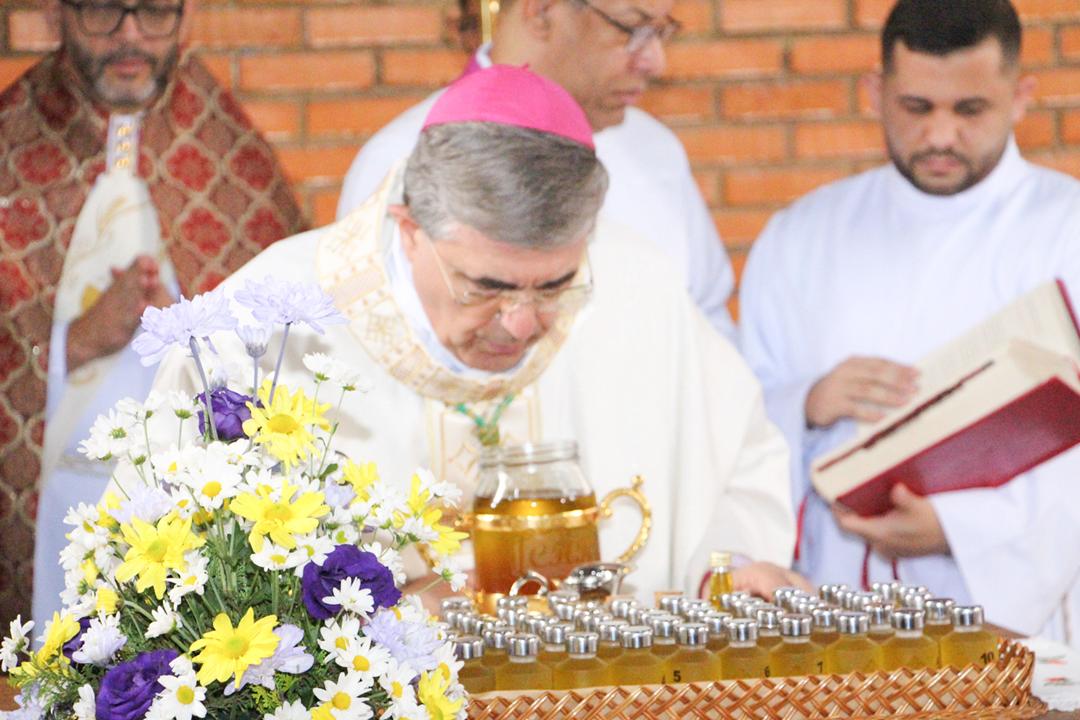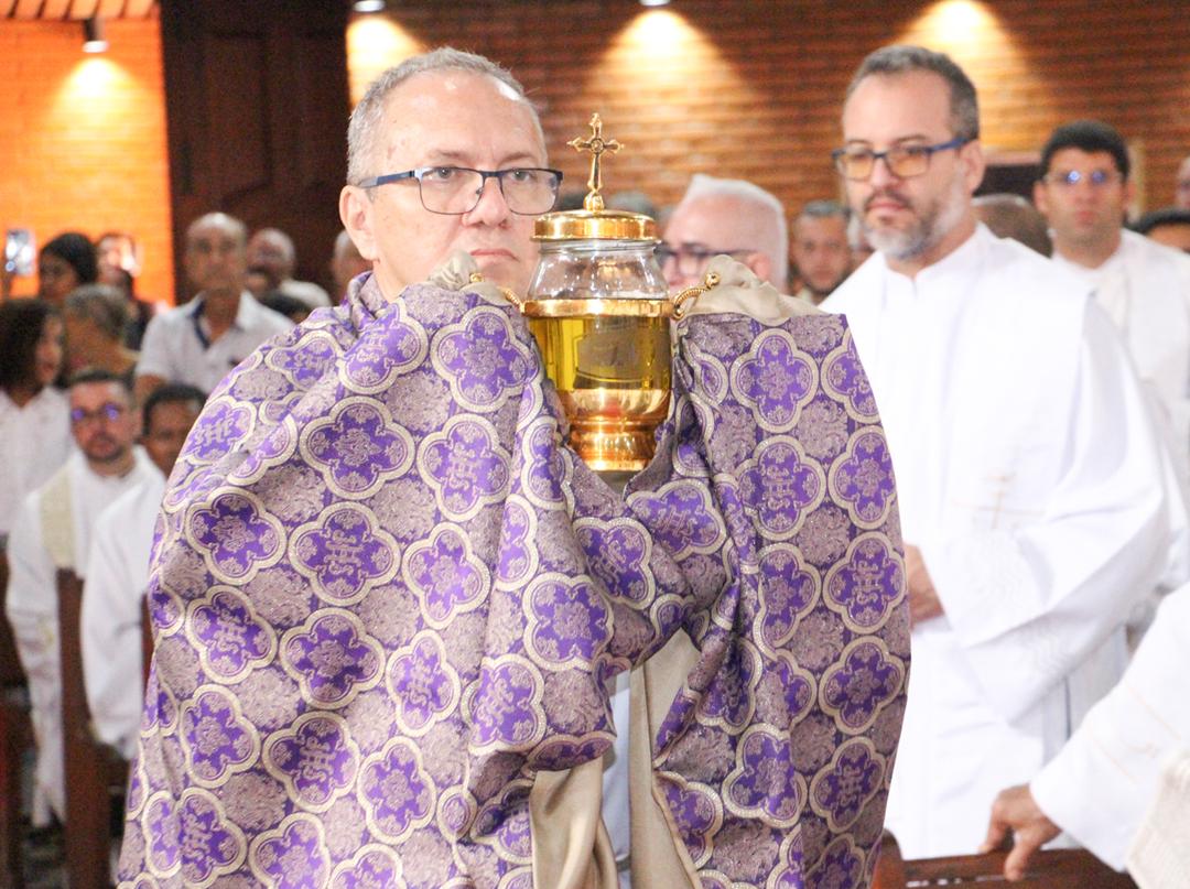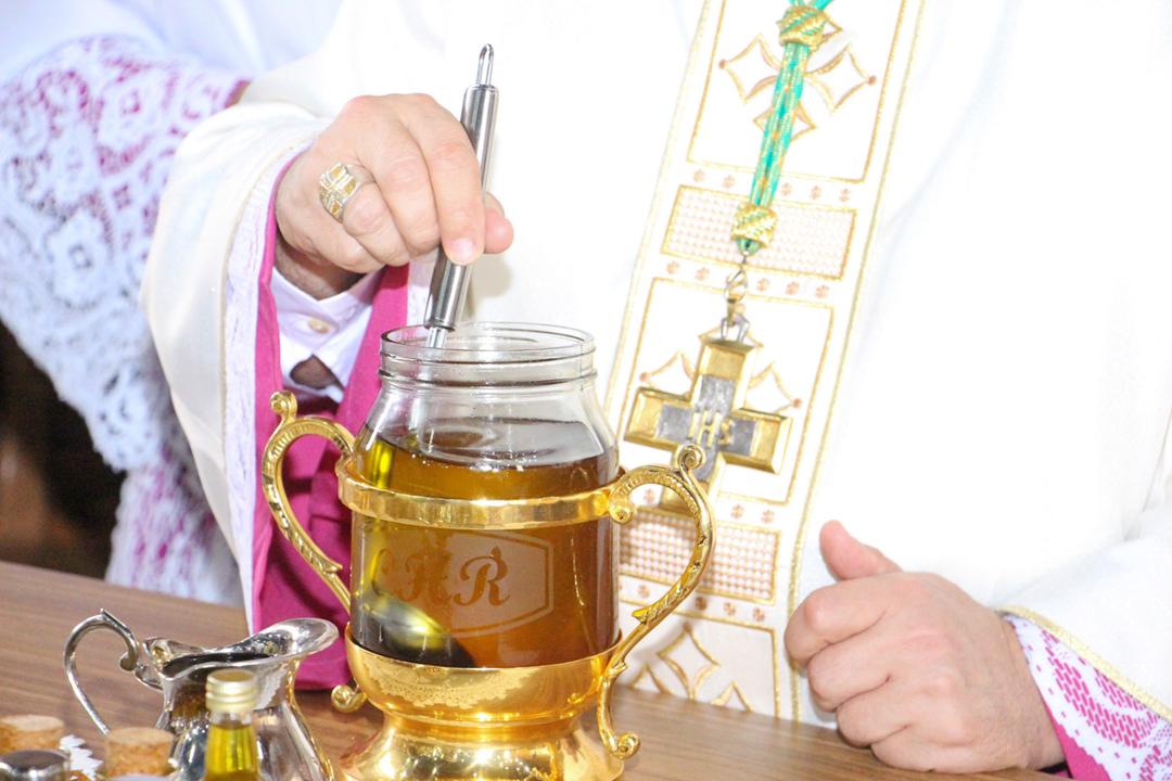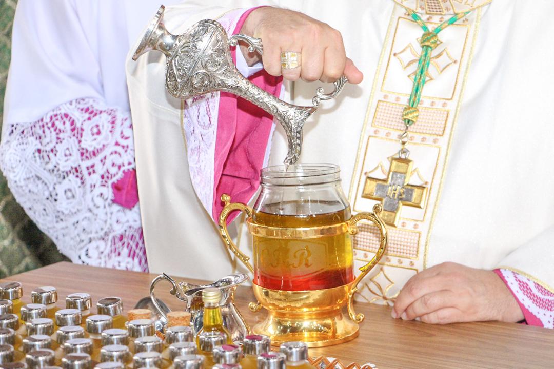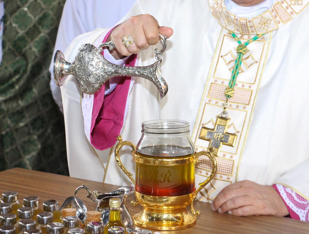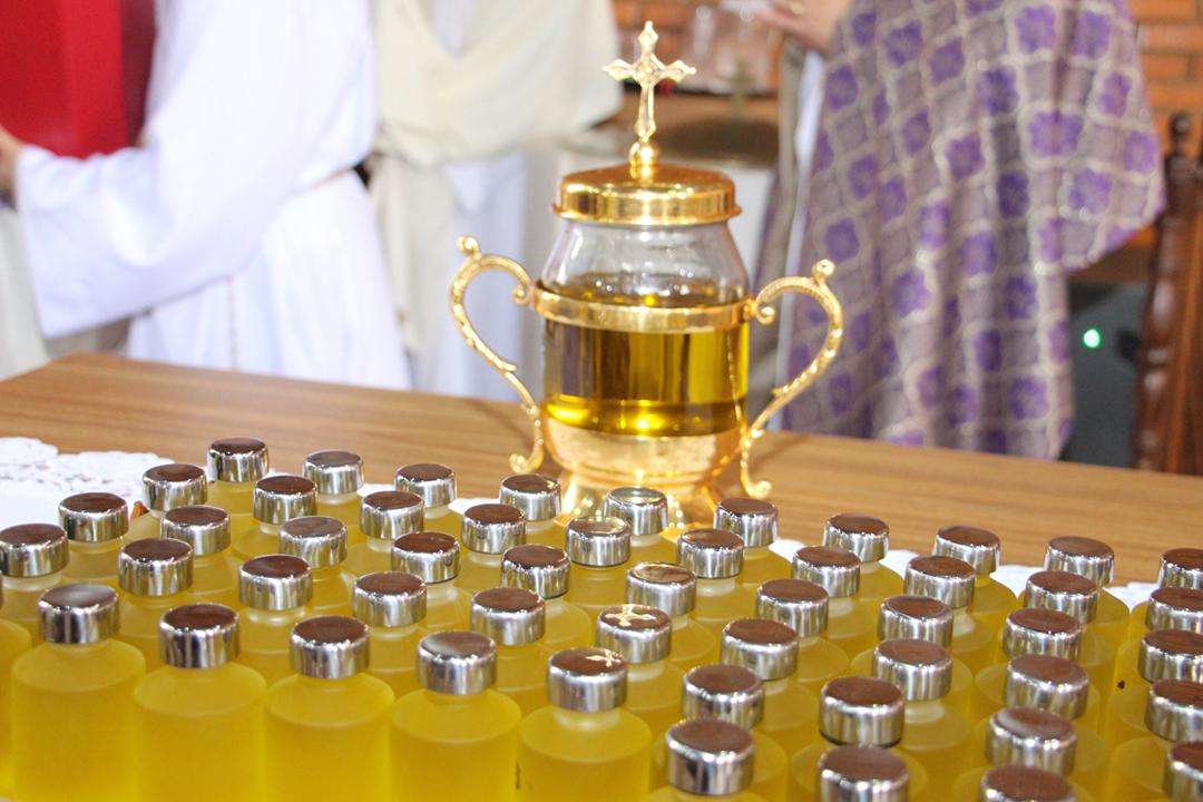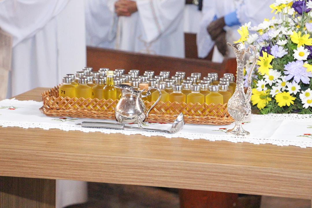 Em seguida, três ânforas contendo azeite de oliva foram conduzidas por diáconos até o altar. O óleo dos catecúmenos – para o Batismo – e o da Unção dos Enfermos, foram abençoados. O óleo do Crisma foi consagrado e recebeu uma porção de bálsamo, um perfume delicado. Esses óleos são utilizados nas unções consacratórias do Batismo (o batizado é ungido no peito), da Confirmação (na fronte), da Ordenação Episcopal (sobre a cabeça do novo bispo) e da Ordenação Sacerdotal (na palma das mãos do neo-sacerdote). Também é utilizado em outros ritos, como na dedicação de uma Igreja e na consagração de um altar.