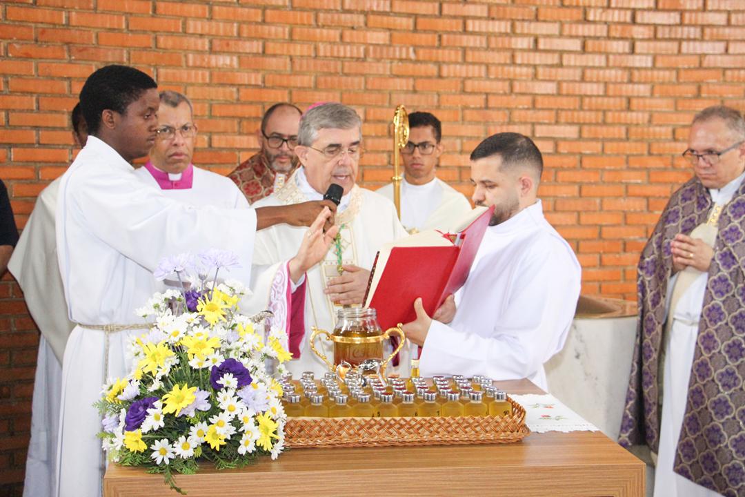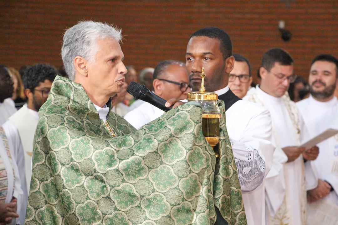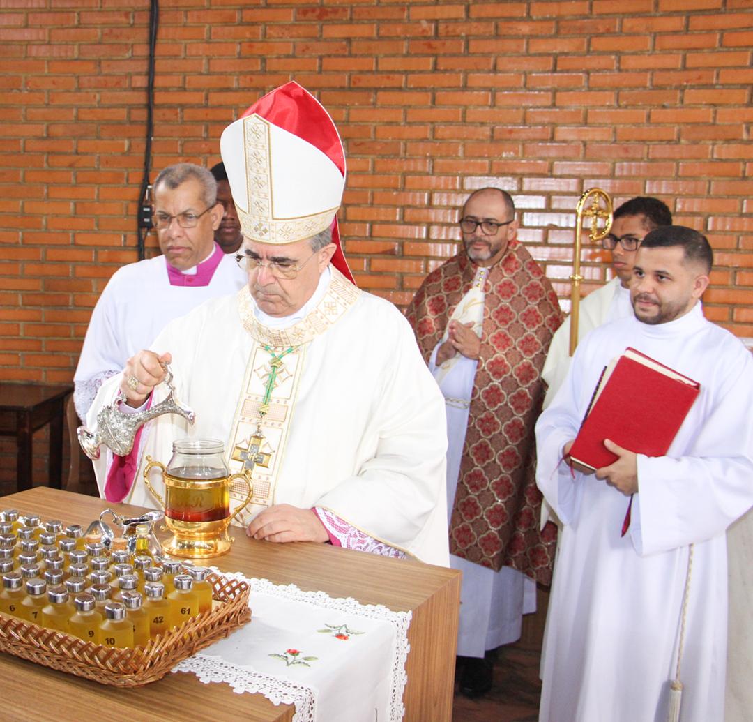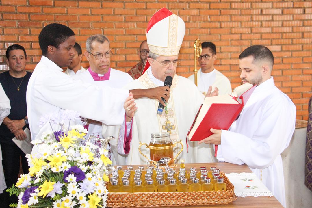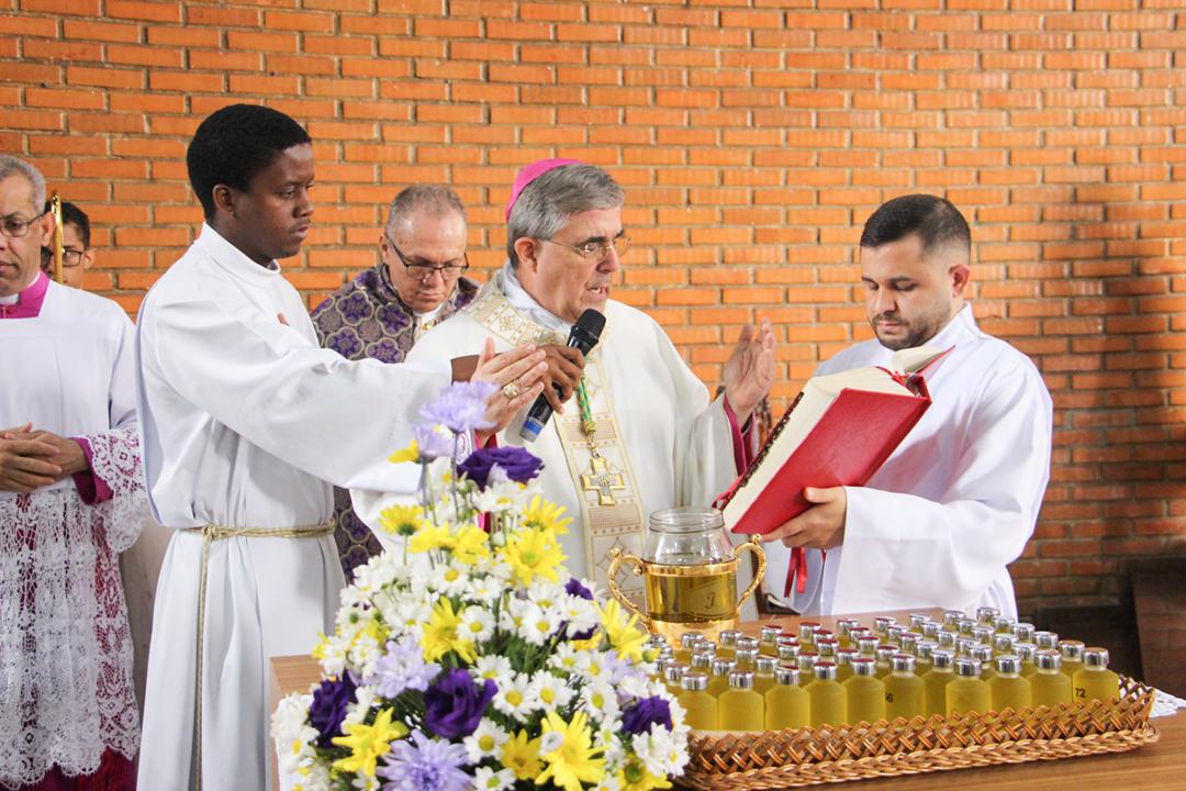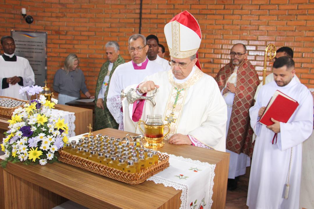 Em seguida, três ânforas contendo azeite de oliva foram conduzidas por diáconos até o altar. O óleo dos catecúmenos – para o Batismo – e o da Unção dos Enfermos, foram abençoados. O óleo do Crisma foi consagrado e recebeu uma porção de bálsamo, um perfume delicado. Esses óleos são utilizados nas unções consacratórias do Batismo (o batizado é ungido no peito), da Confirmação (na fronte), da Ordenação Episcopal (sobre a cabeça do novo bispo) e da Ordenação Sacerdotal (na palma das mãos do neo-sacerdote). Também é utilizado em outros ritos, como na dedicação de uma Igreja e na consagração de um altar.
