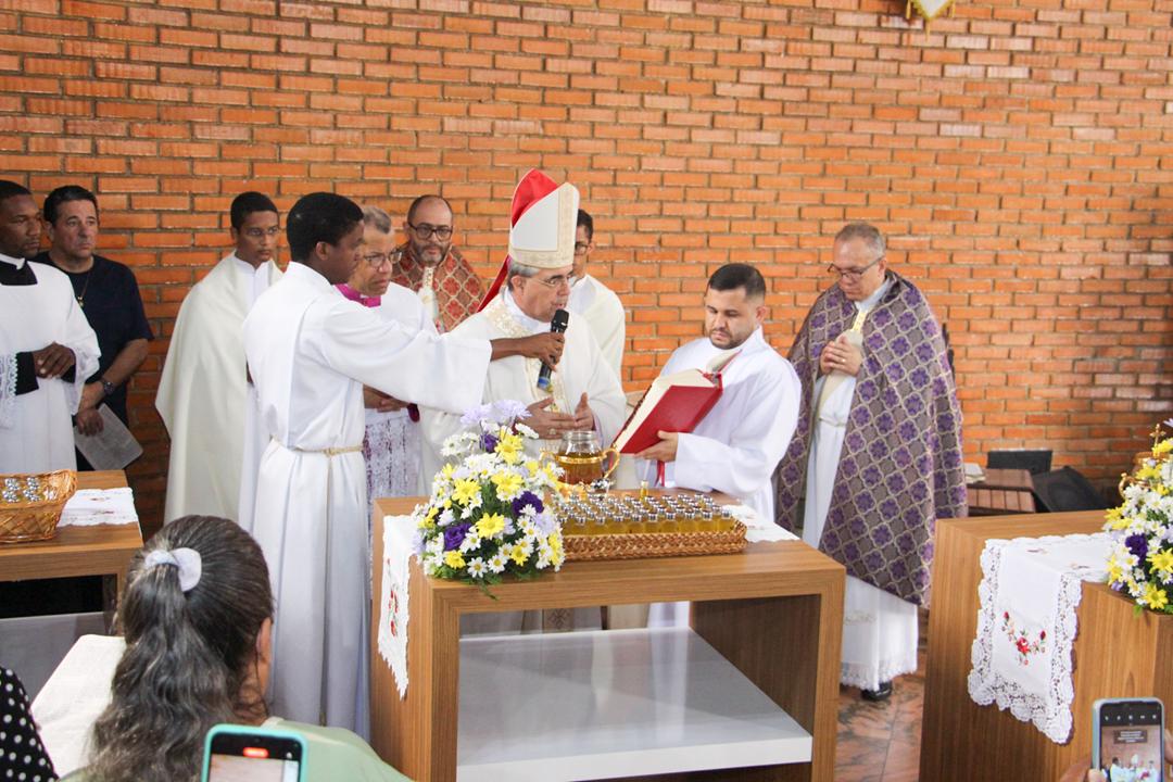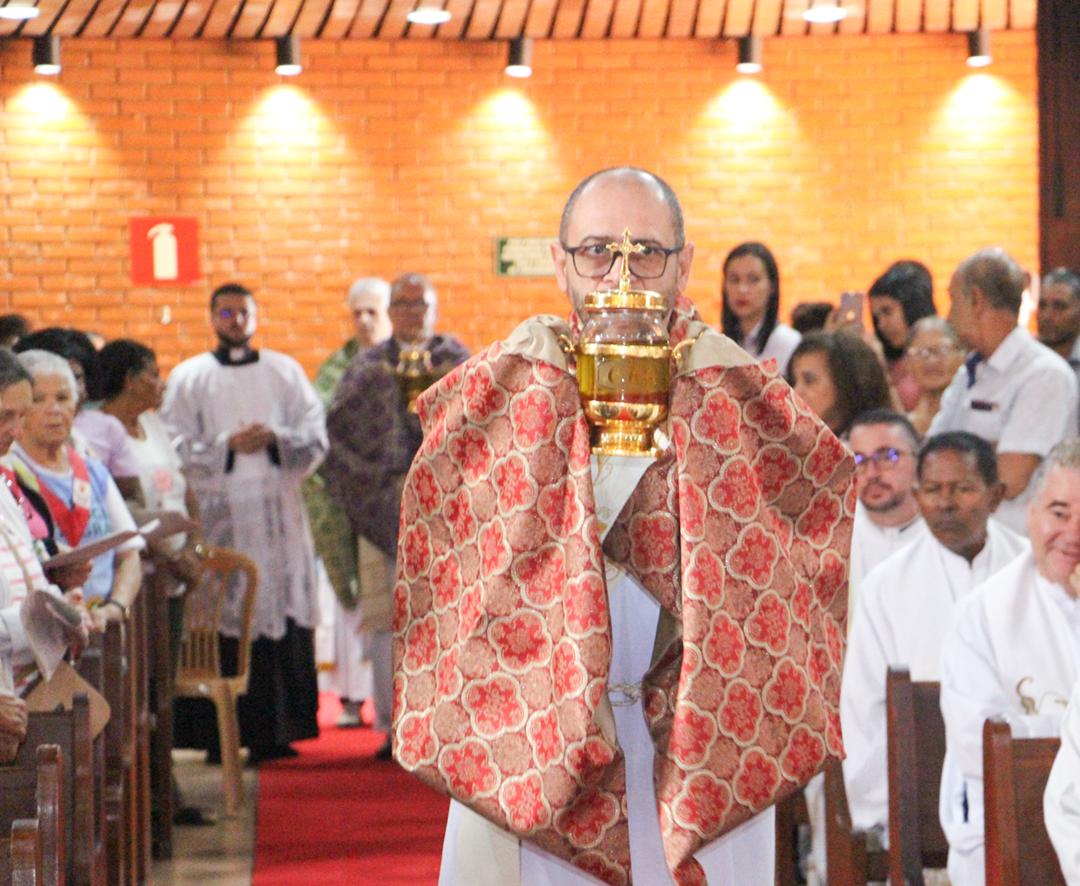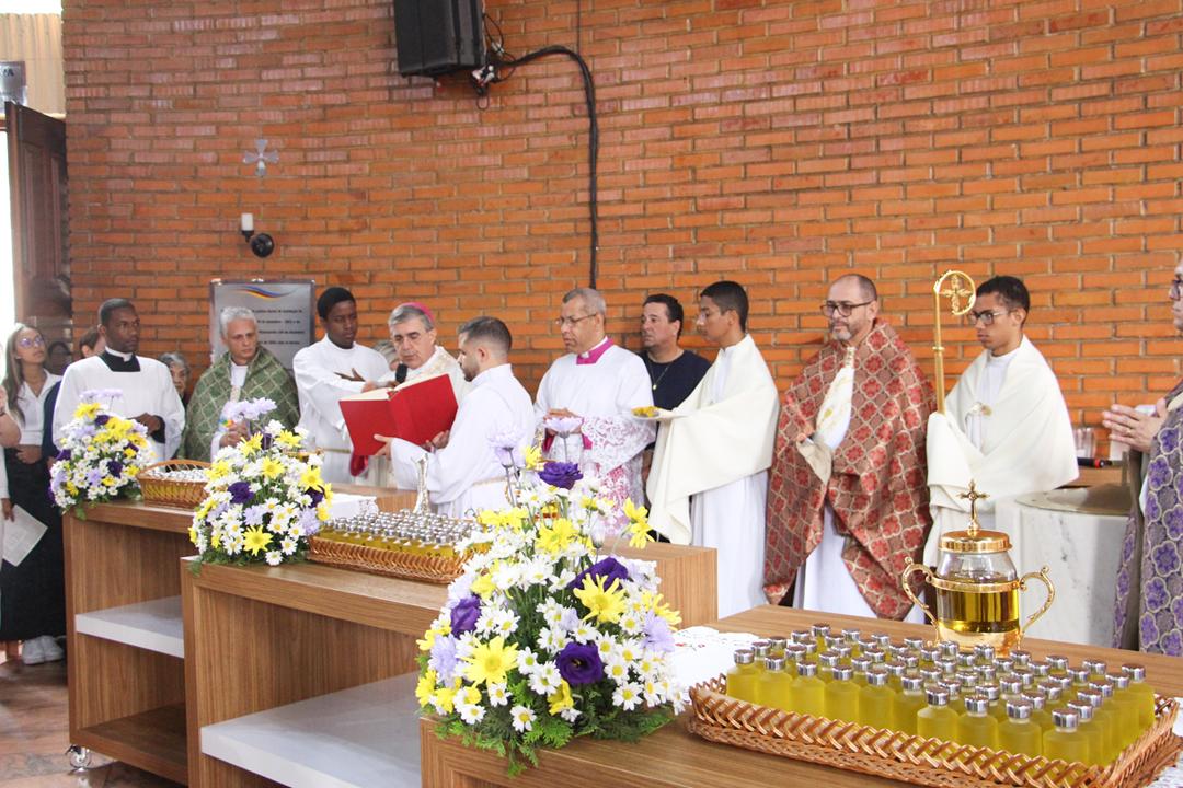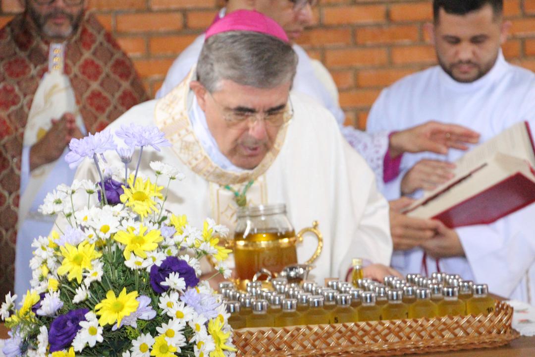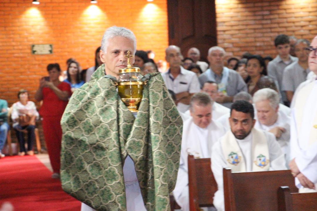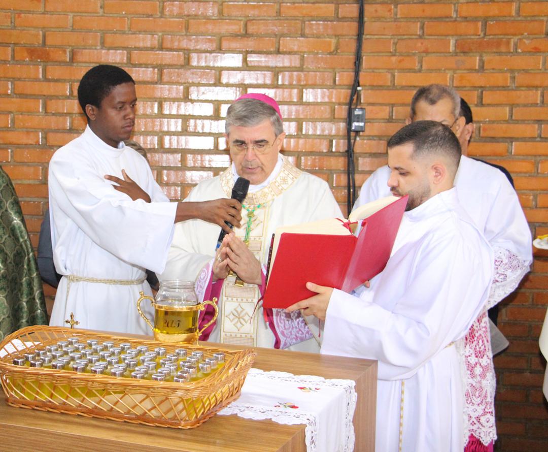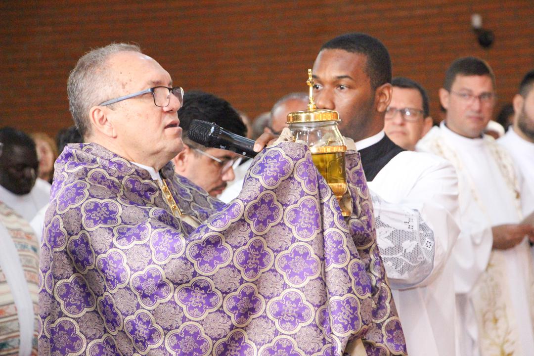Em seguida, três ânforas contendo azeite de oliva foram conduzidas por diáconos até o altar. O óleo dos catecúmenos – para o Batismo – e o da Unção dos Enfermos, foram abençoados. O óleo do Crisma foi consagrado e recebeu uma porção de bálsamo, um perfume delicado. Esses óleos são utilizados nas unções consacratórias do Batismo (o batizado é ungido no peito), da Confirmação (na fronte), da Ordenação Episcopal (sobre a cabeça do novo bispo) e da Ordenação Sacerdotal (na palma das mãos do neo-sacerdote). Também é utilizado em outros ritos, como na dedicação de uma Igreja e na consagração de um altar.