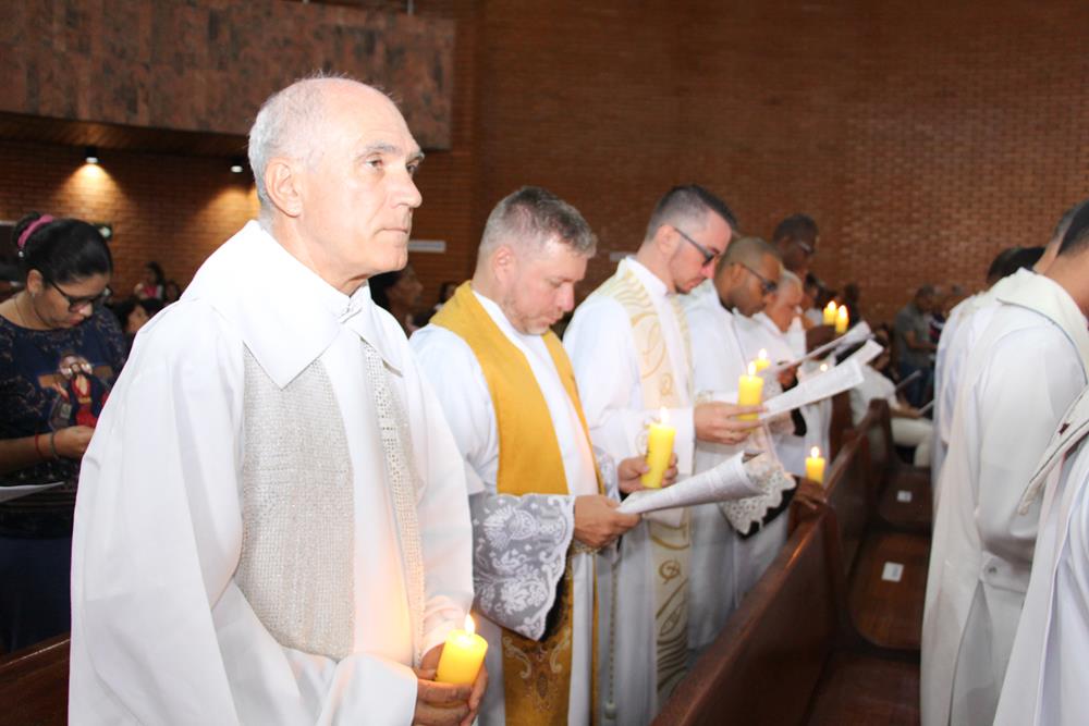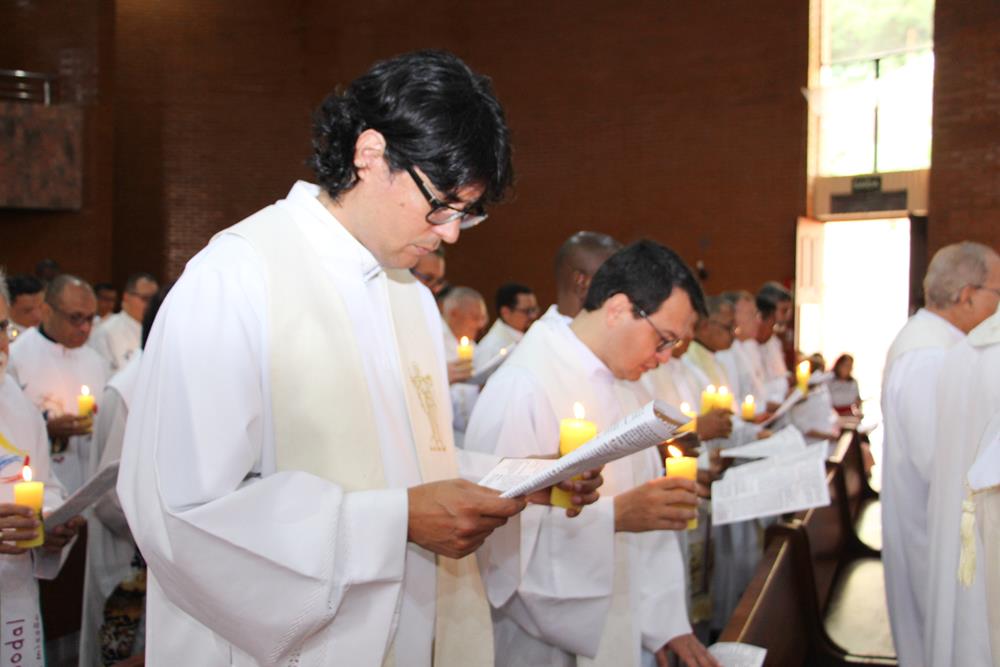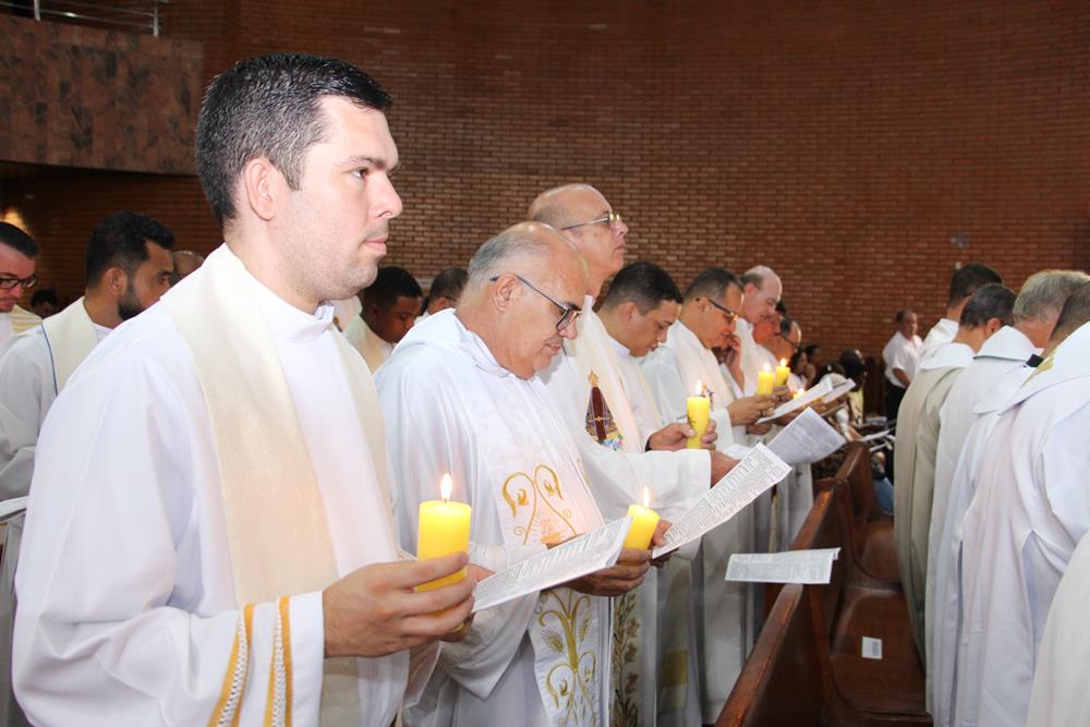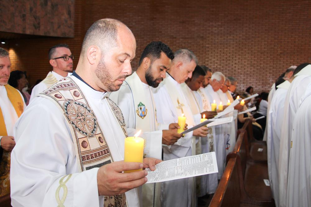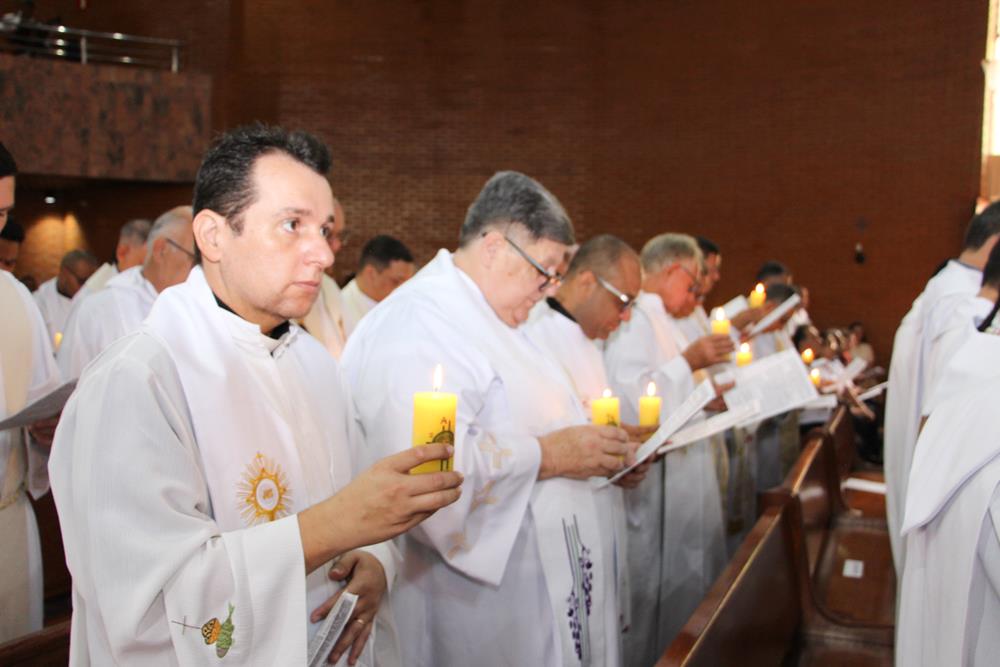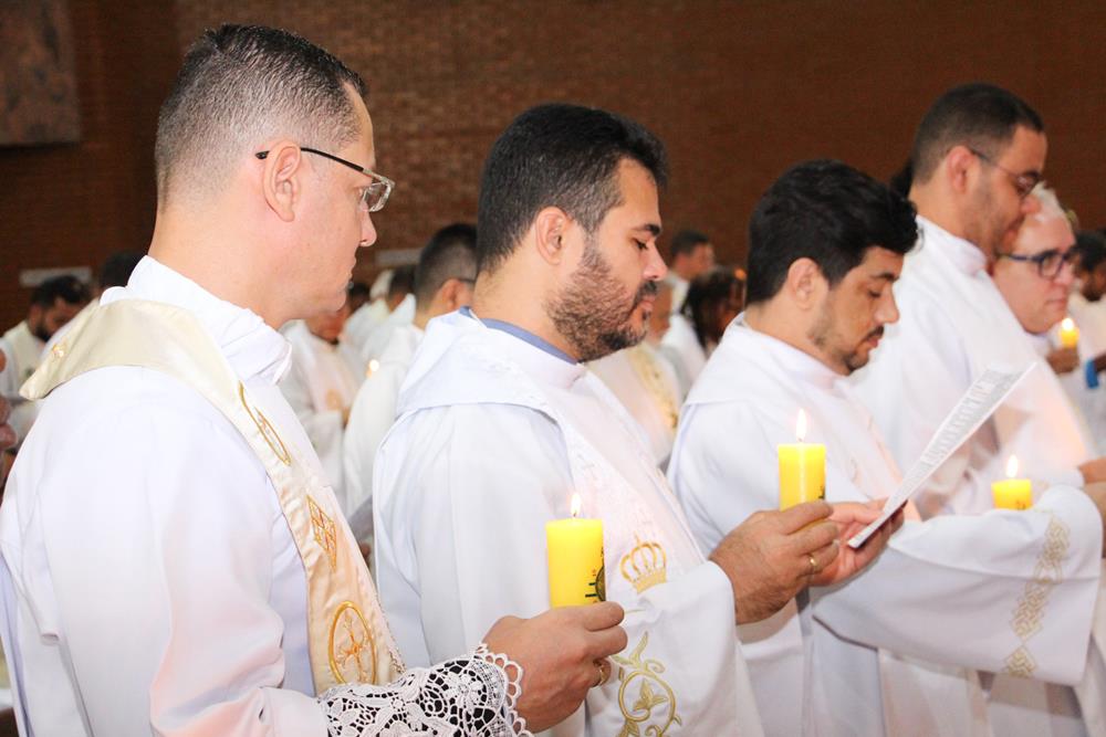 Após a homilia, os padres renovaram as promessas que foram feitas no dia da Ordenação Presbiteral. A renovação da vida sacerdotal, a renovação das Promessas Sacerdotais, embora de cunho pessoal, acontece de forma comunitária, com o clero reunido com o bispo ao redor do altar. Esse gesto que acontece a cada ano não é um simples rito, tem um significado profundo, cada padre renova as suas promessas sacerdotais com os seus irmãos no sacerdócio e com o bispo. Renova os compromissos sacerdotais diante do altar, que é a fonte, o sustento do sacerdócio; renova as Promessas Sacerdotais contando com os fiéis, reunidos e unidos em oração, com os cristãos leigos e leigas que tem um papel tão importante na Igreja. Portanto, para reavivar o dom de Deus recebido na Ordenação, precisam sempre desse olhar: para o altar, para o presbitério e para o povo, a comunidade. E este olhar deve se repetir a cada dia, para que todos possam experimentar, sempre mais, a alegria de ser discípulo do Senhor, de ser sacerdote do Senhor na sua Igreja.
