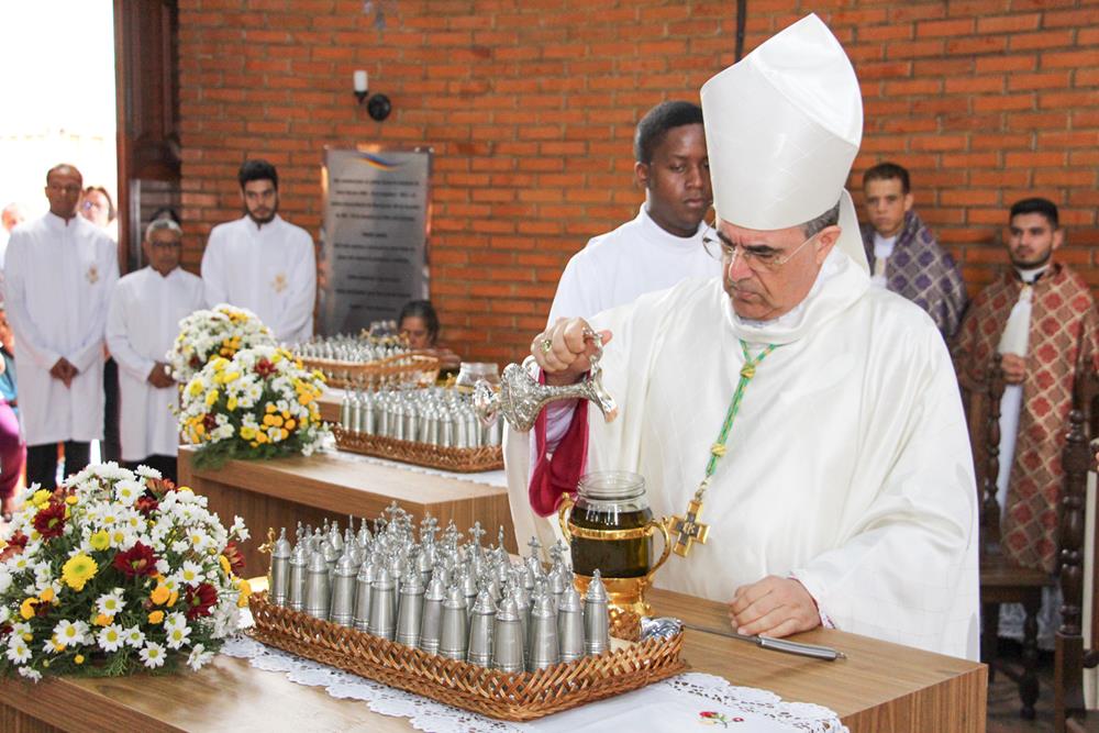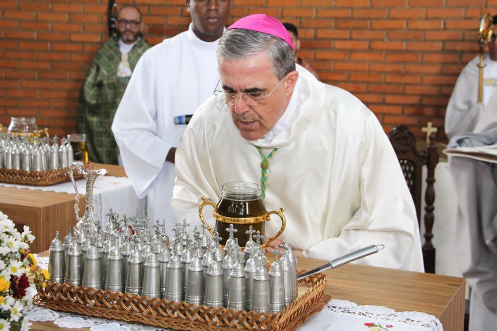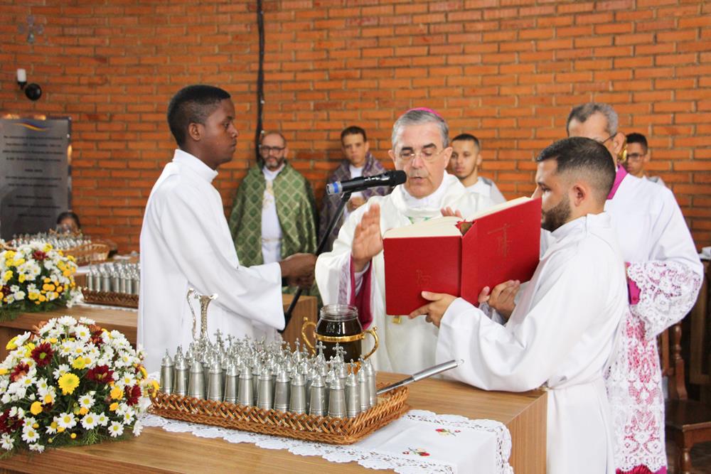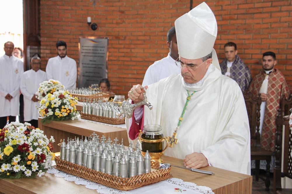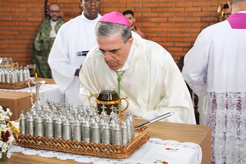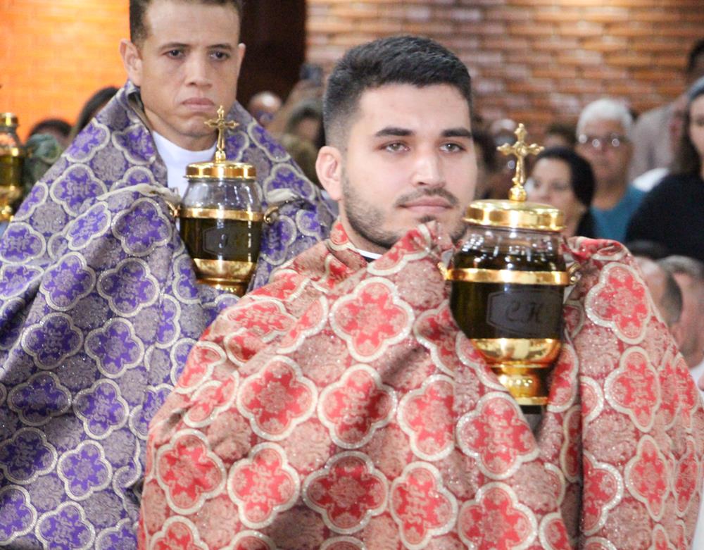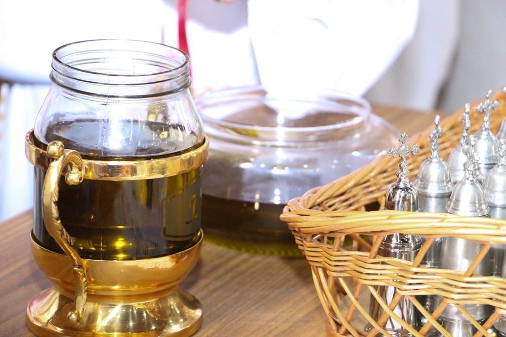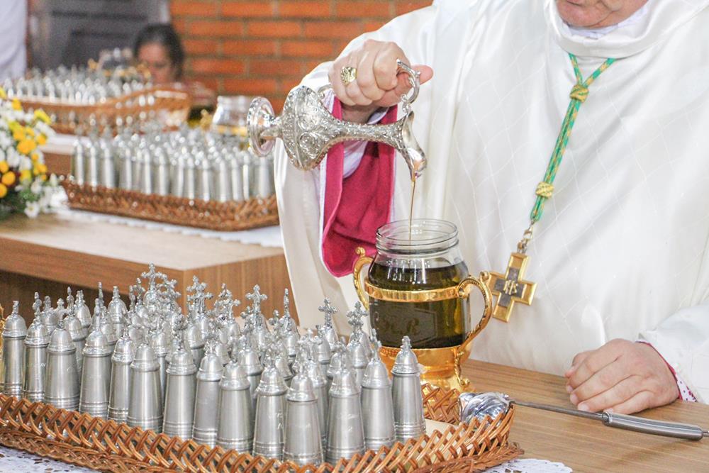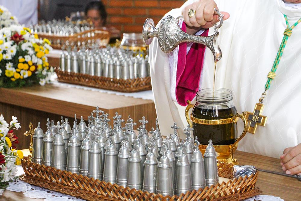 Em seguida, três ânforas contendo azeite de oliva foram conduzidas por diáconos até o altar. O óleo dos catecúmenos – usado no Batismo – e o da Unção dos Enfermos foram abençoados. O óleo do Crisma foi consagrado e recebeu uma porção de bálsamo, um perfume delicado. Esses óleos são utilizados nas unções consacratórias do Batismo (o batizado é ungido no peito), da Confirmação (na fronte), da Ordenação Episcopal (sobre a cabeça do novo bispo) e da Ordenação Sacerdotal (na palma das mãos do neo-sacerdote). Também é utilizado em outros ritos, como na dedicação de uma Igreja e na consagração de um altar.