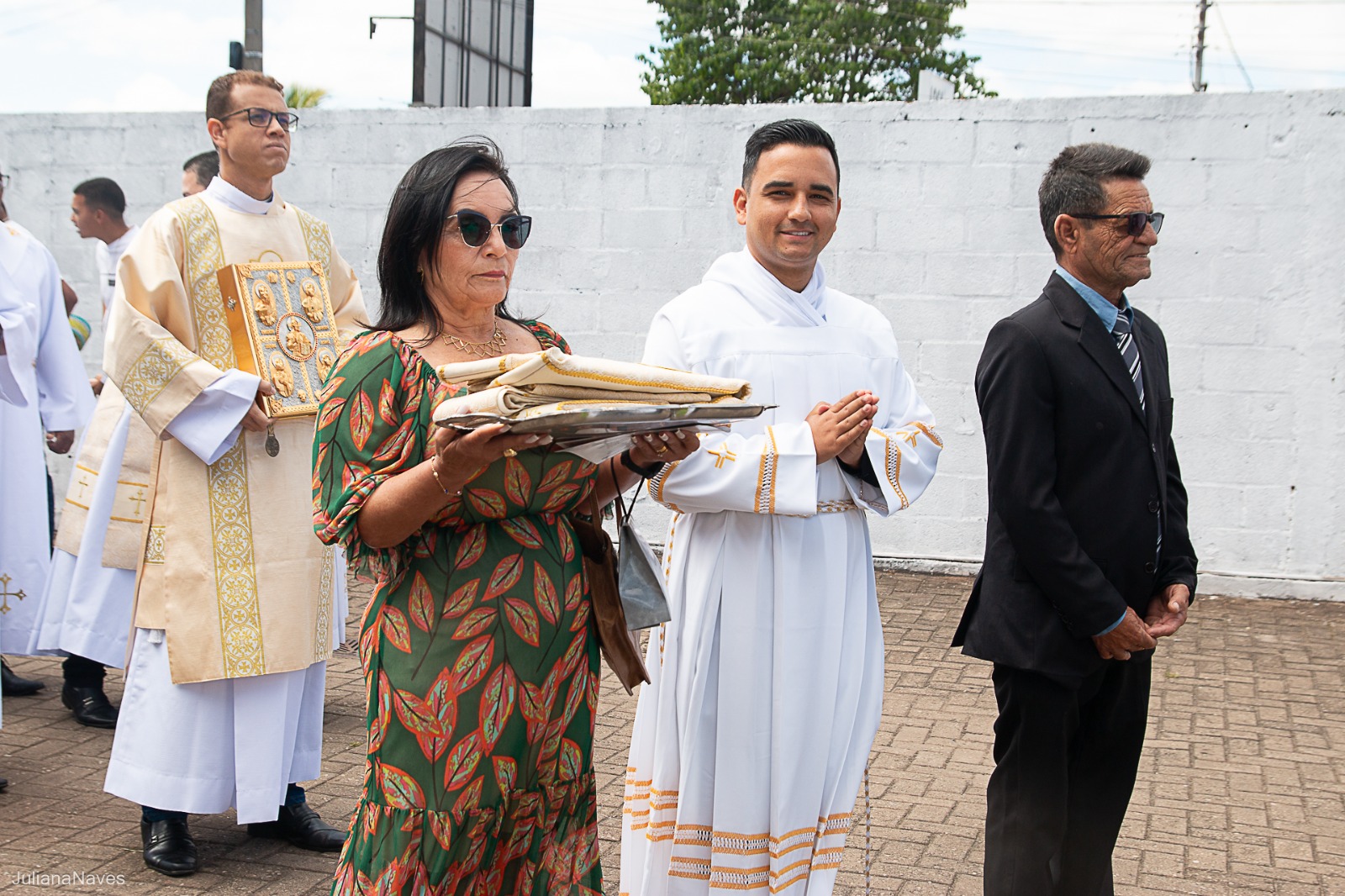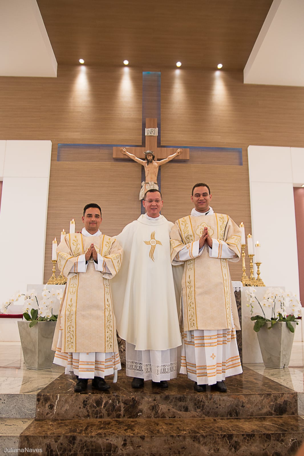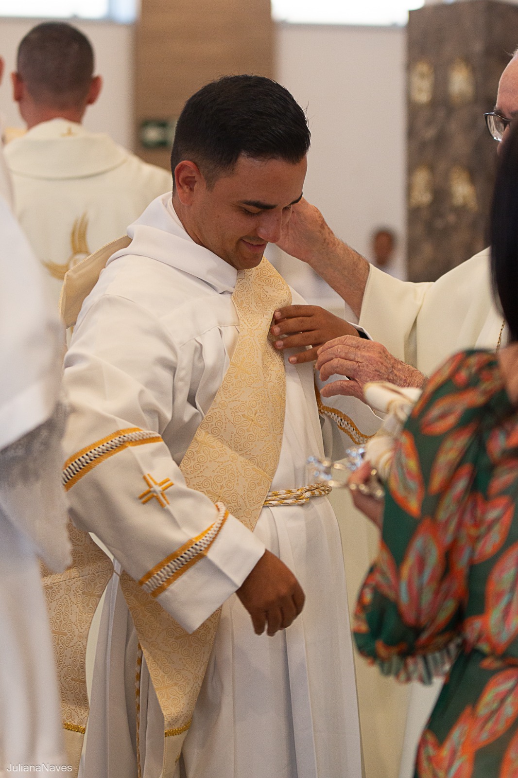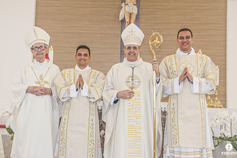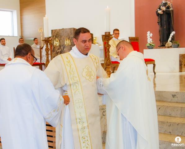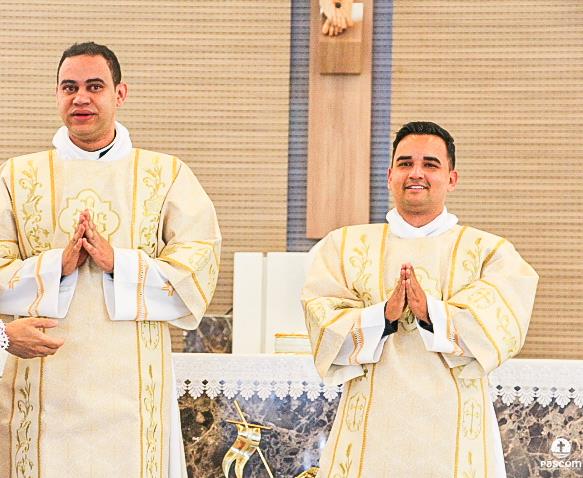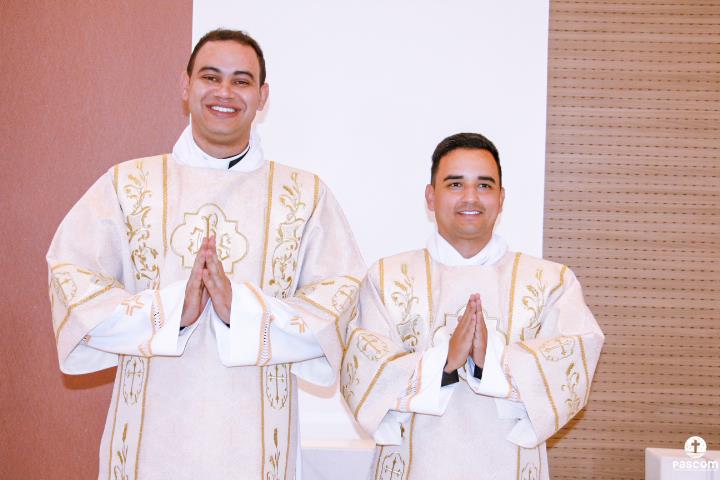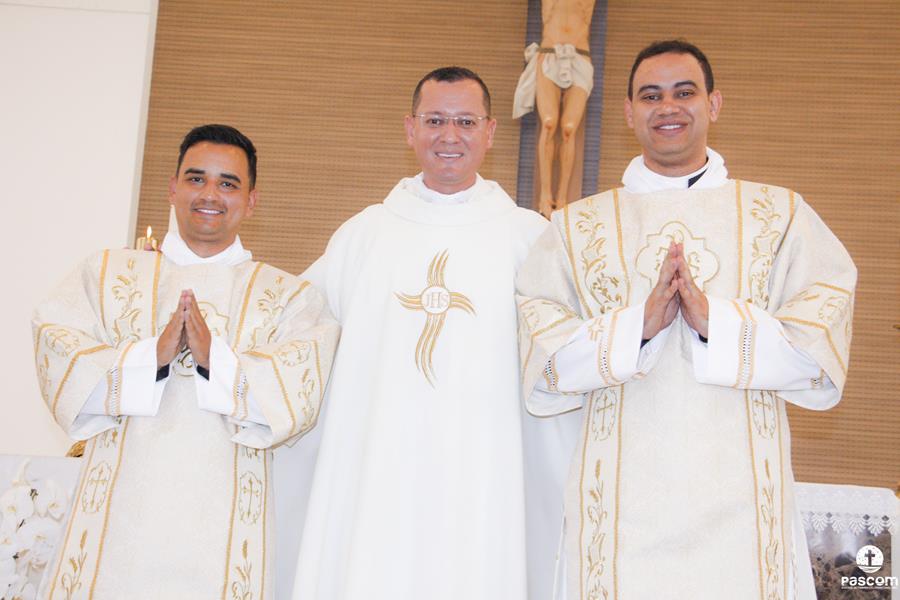 Depois, cada um dos novos diáconos foi revestido da estola e da dalmática, como sinal do serviço ministerial para o qual foram ordenados. As vestes foram levadas a cada um deles por seus pais. Júlio Cesar Santos foi revestido pelos padres Ueliton Neves e Marcos Rosa e Paulo Henrique de Souza Leal por Dom Odilon Guimarães e o Diácono Permanente Geraldo Evangelista.