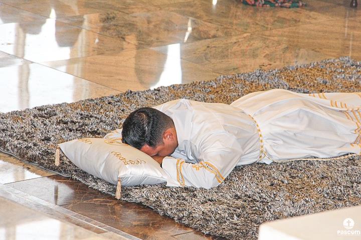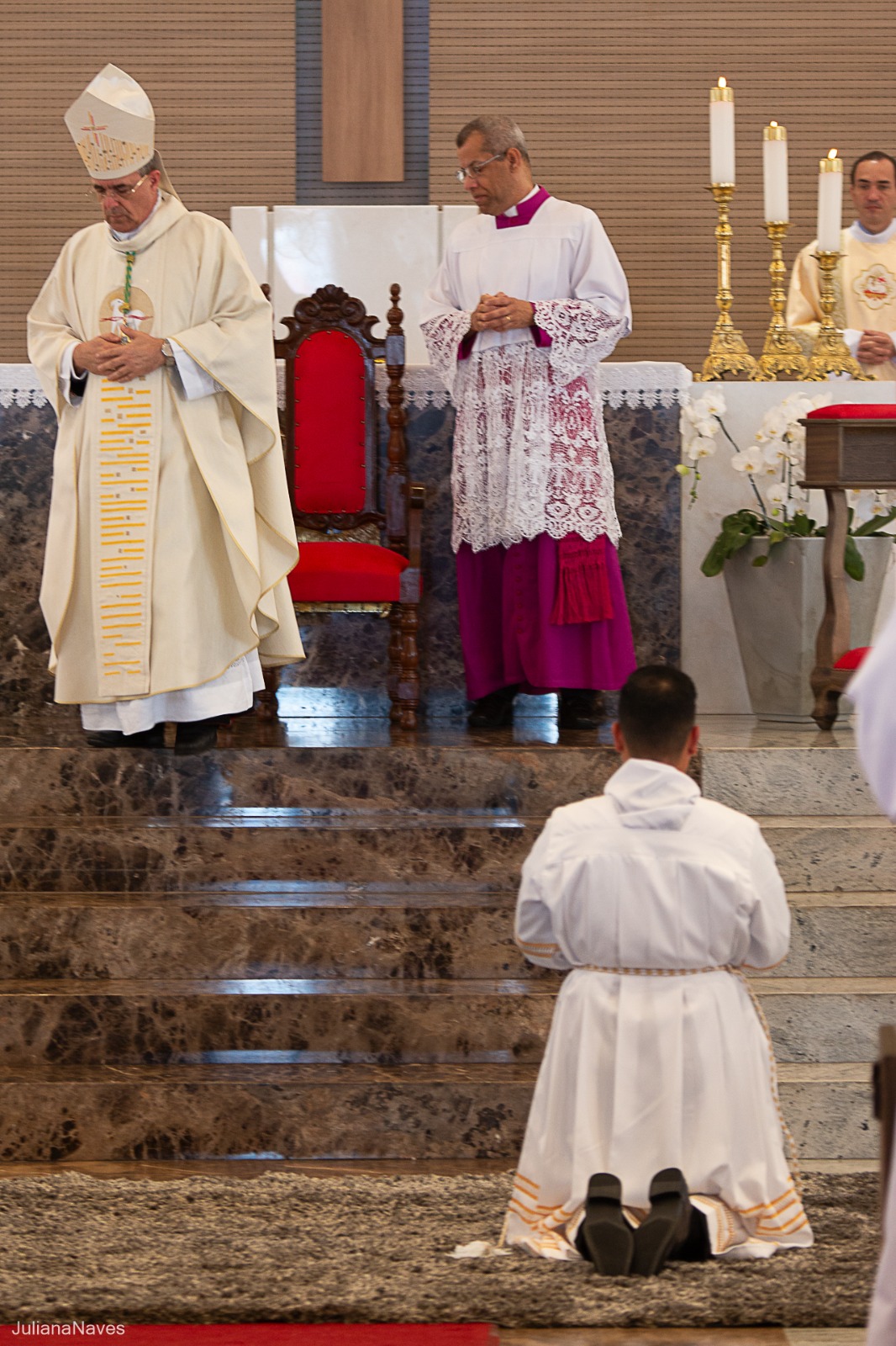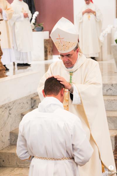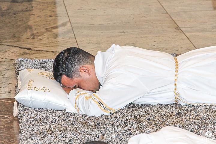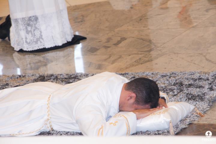 Na sequência, com os diáconos prostrados diante do presbitério, foi entoada a Ladainha de Todos os Santos, após a qual se seguiu a imposição das mãos e a prece de ordenação rezada por Dom Marco Aurélio Gubiotti.