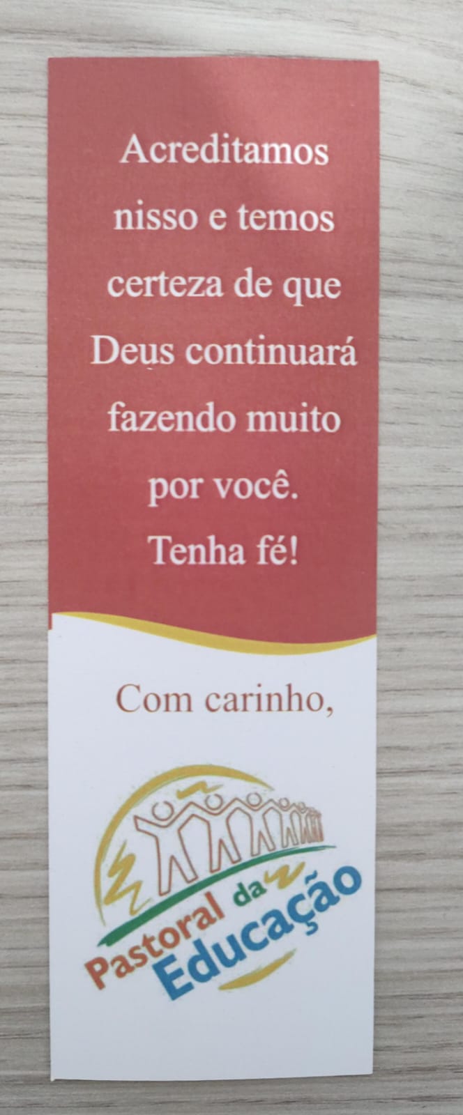 Terminando o encontro, o vigário da Paróquia Santo Antônio falou sobre a padroeira dos professores – Santa Teresa d’Ávila, doutora da igreja e reconhecida universalmente por seus textos – e entregou a todos um marcador de páginas com uma das frases da Santa, lembrando uma crença que a Pastoral tem: “É grande coisa o que fazemos por Deus, mas maior ainda o que ele faz por nós.”