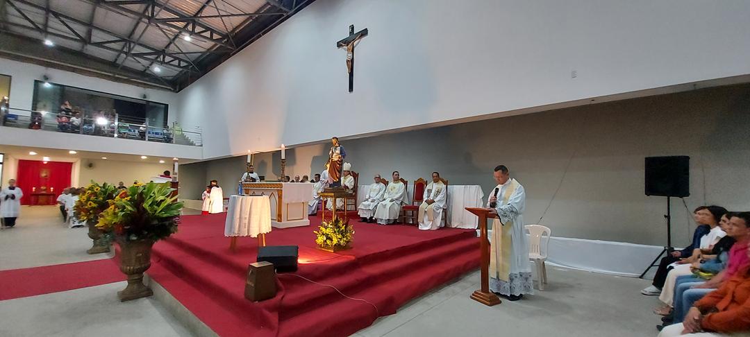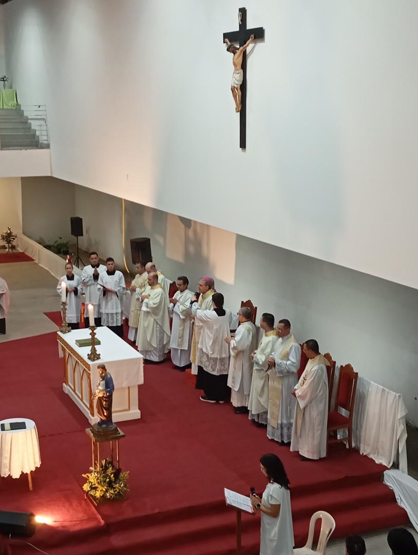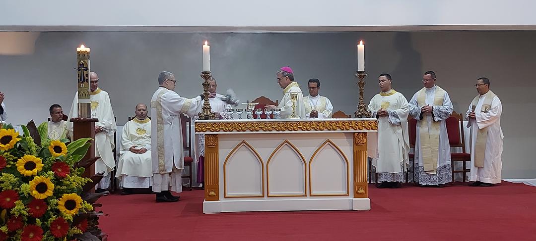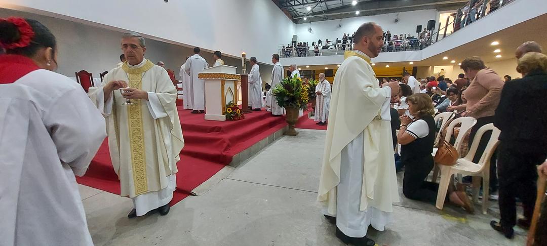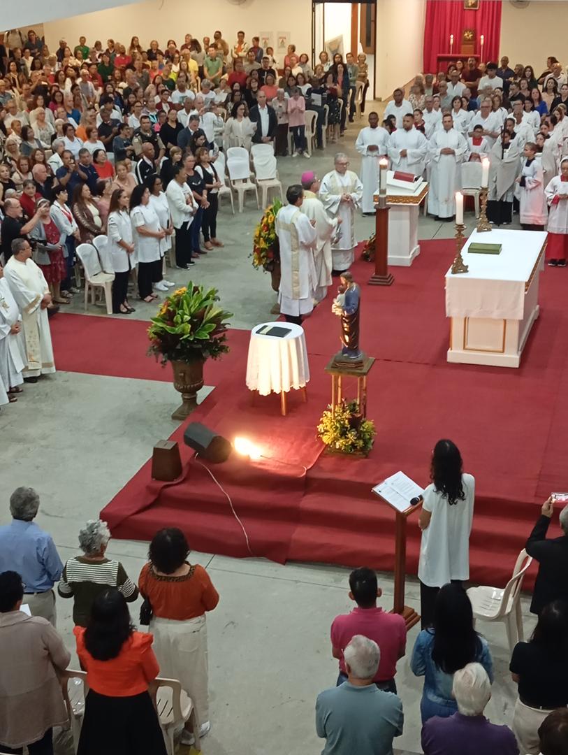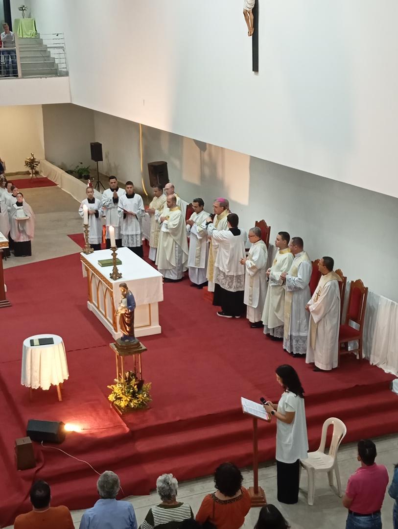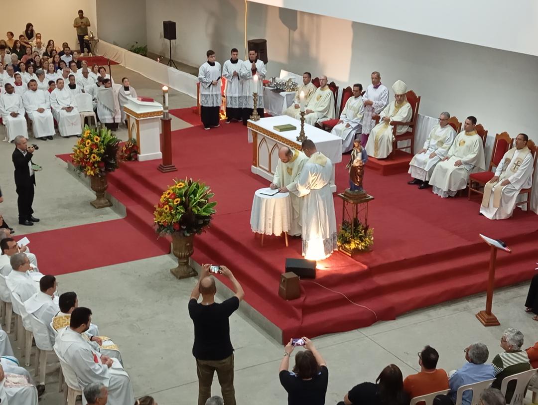 A celebração eucarística contou com a presença de autoridades civis e de uma grande porção do Povo de Deus. Foi concelebrada por diversos padres da Diocese, contando também com a presença de alguns diáconos permanentes e dos seminaristas estagiários de nossa Diocese: André, Marlon e Robson.