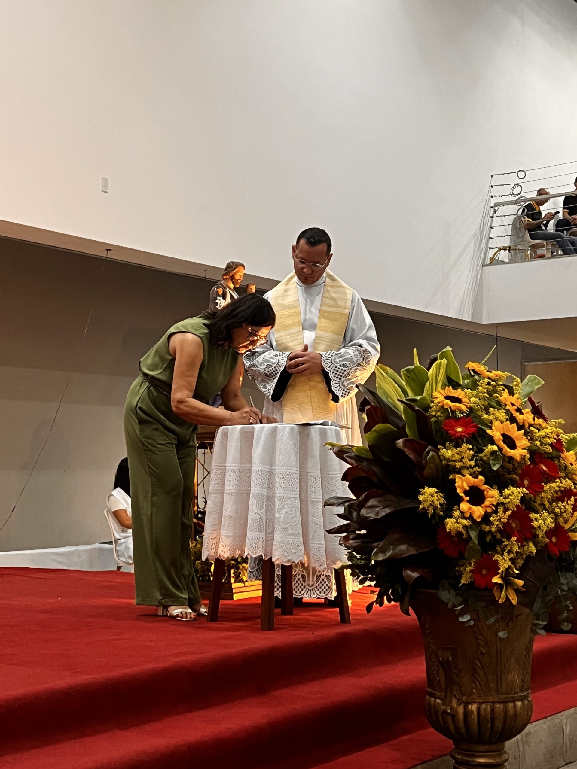 A celebração prosseguiu com a oração dos fiéis e a liturgia eucarística. Ao final da missa, Pe. Fernando Andrade agradeceu a presença de todos, bem como o acolhimento que recebeu de toda a paróquia. Por fim, o Chanceler proferiu a leitura da ata de posse, que, logo em seguida, foi assinada pelas pessoas de direito.