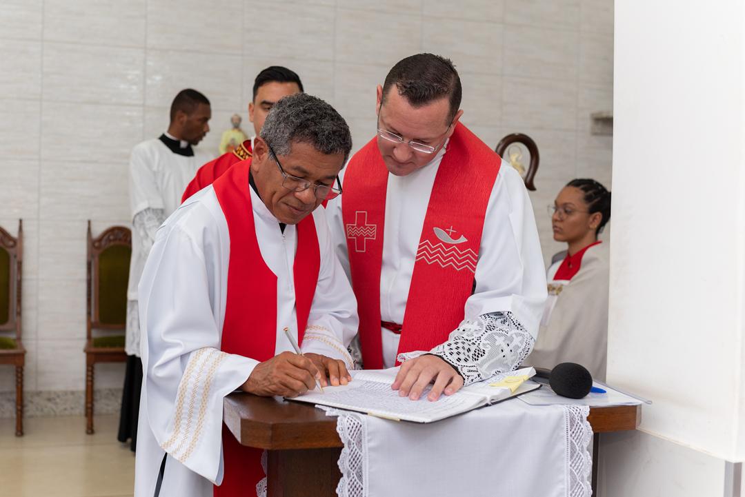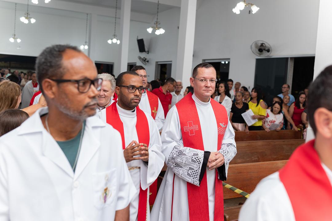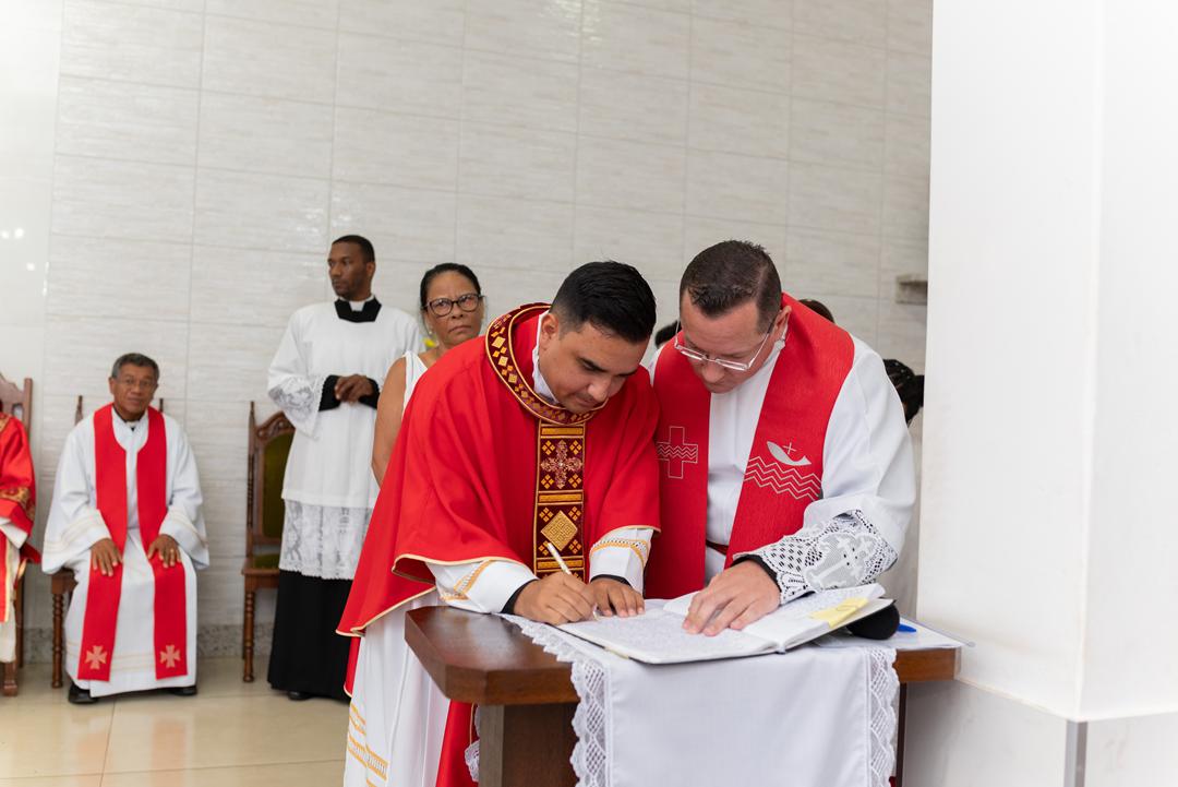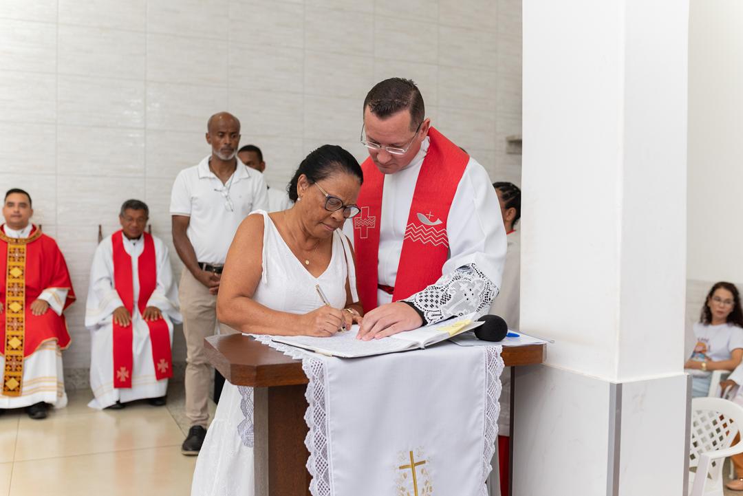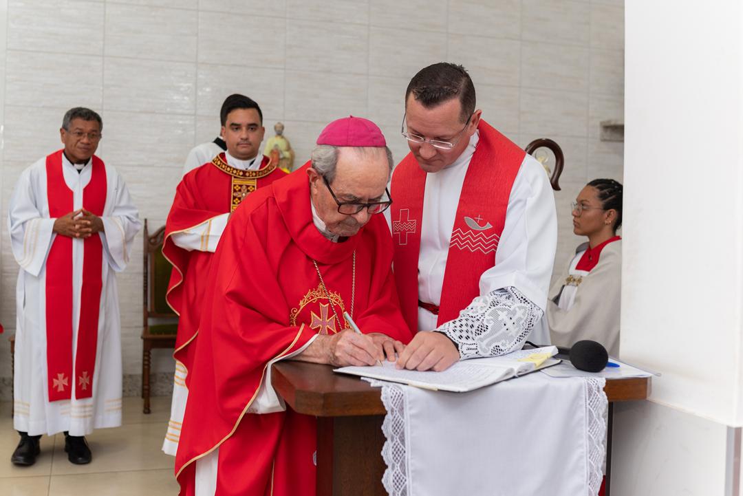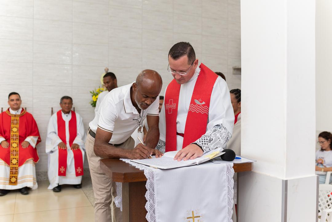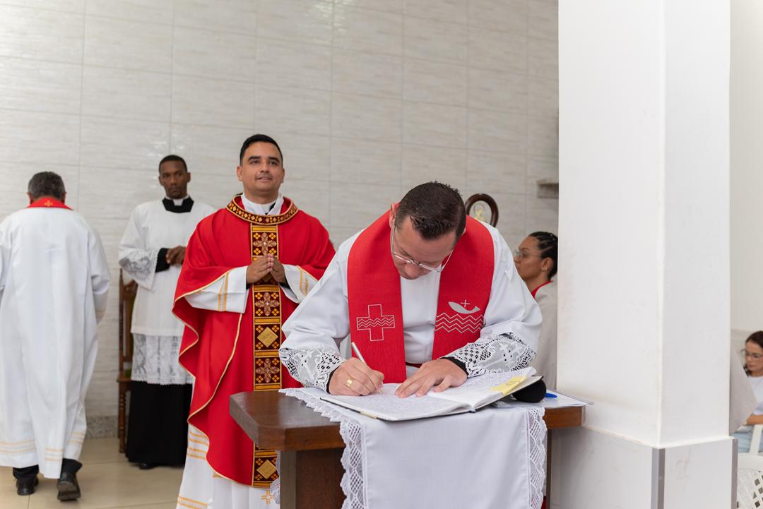 A Celebração prosseguiu com a oração dos fiéis e a liturgia eucarística. Após a oração pós-comunhão, Pe. Paulo foi acolhido com palavras de esperança e de incentivo à sua nova missão, e este dirigiu palavras de agradecimento pelo acolhimento da comunidade. O Chanceler proferiu a leitura da ata de posse que, logo em seguida, foi assinada pelas pessoas de direito.