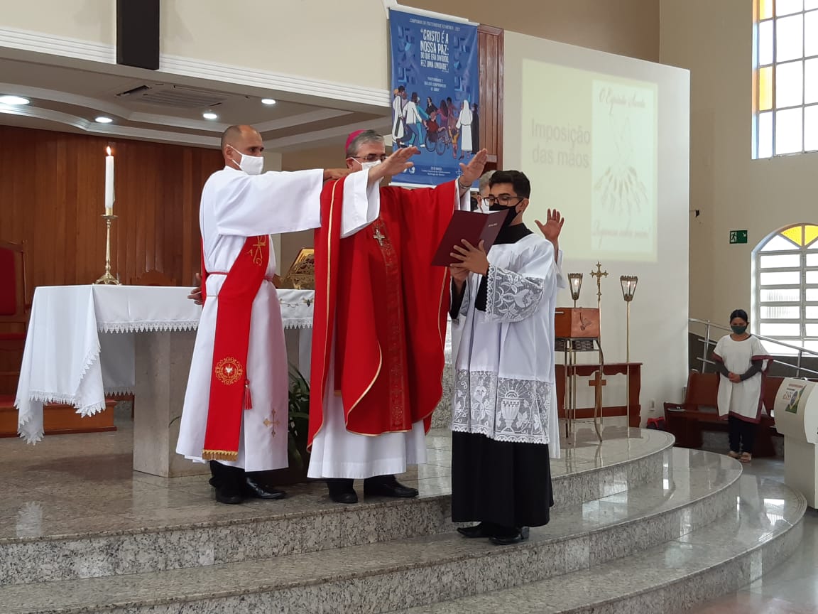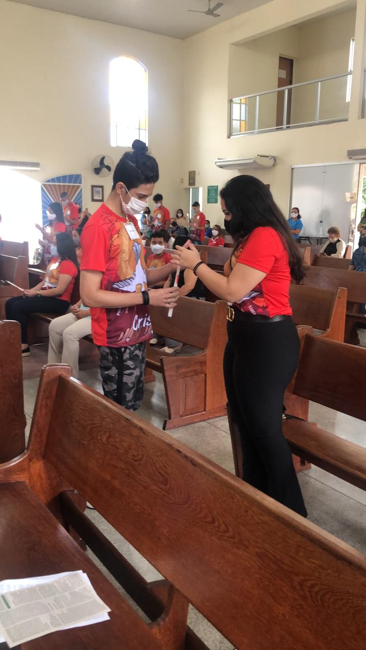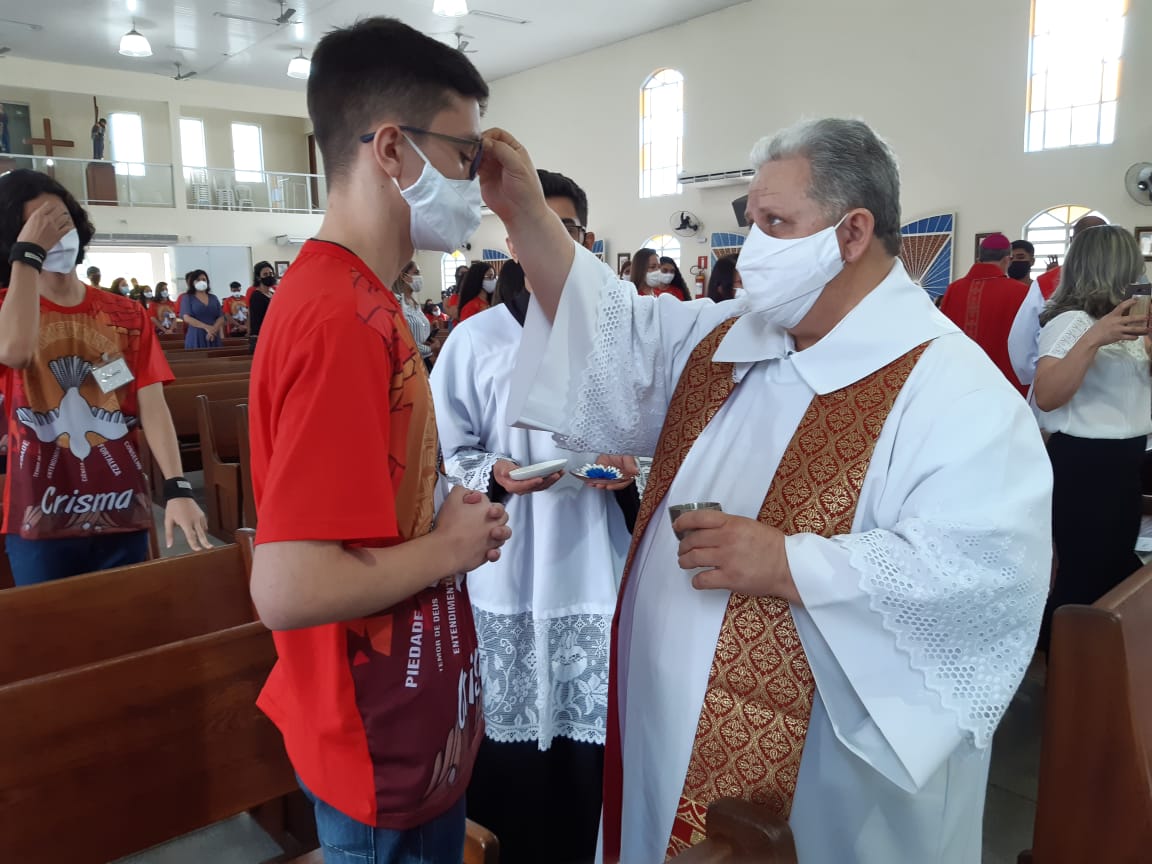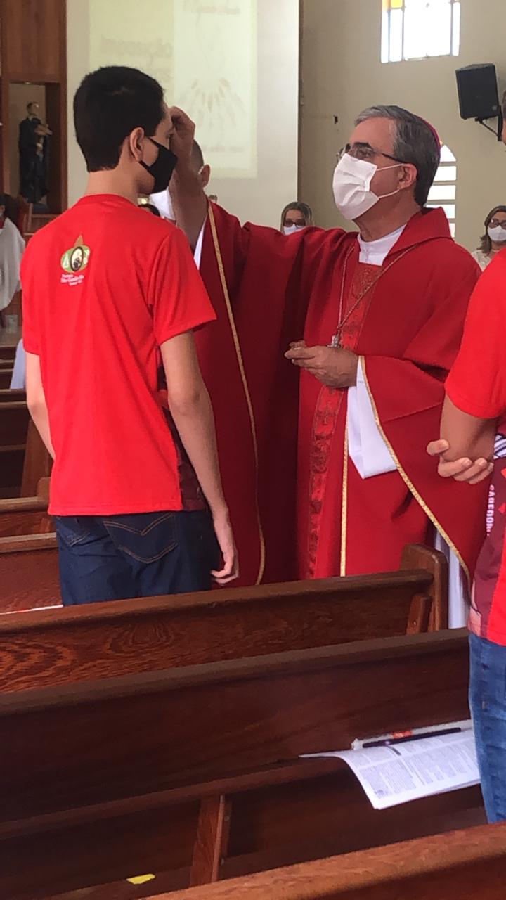 Após a homilia, Dom Marco seguiu a cerimônia com o rito da crisma com a renovação das promessas batismais e, auxiliado pelo Pe. Aloisio Vieira, cada qual em seu devido lugar, foi ungido na fronte com o óleo do Crisma os crismandos.