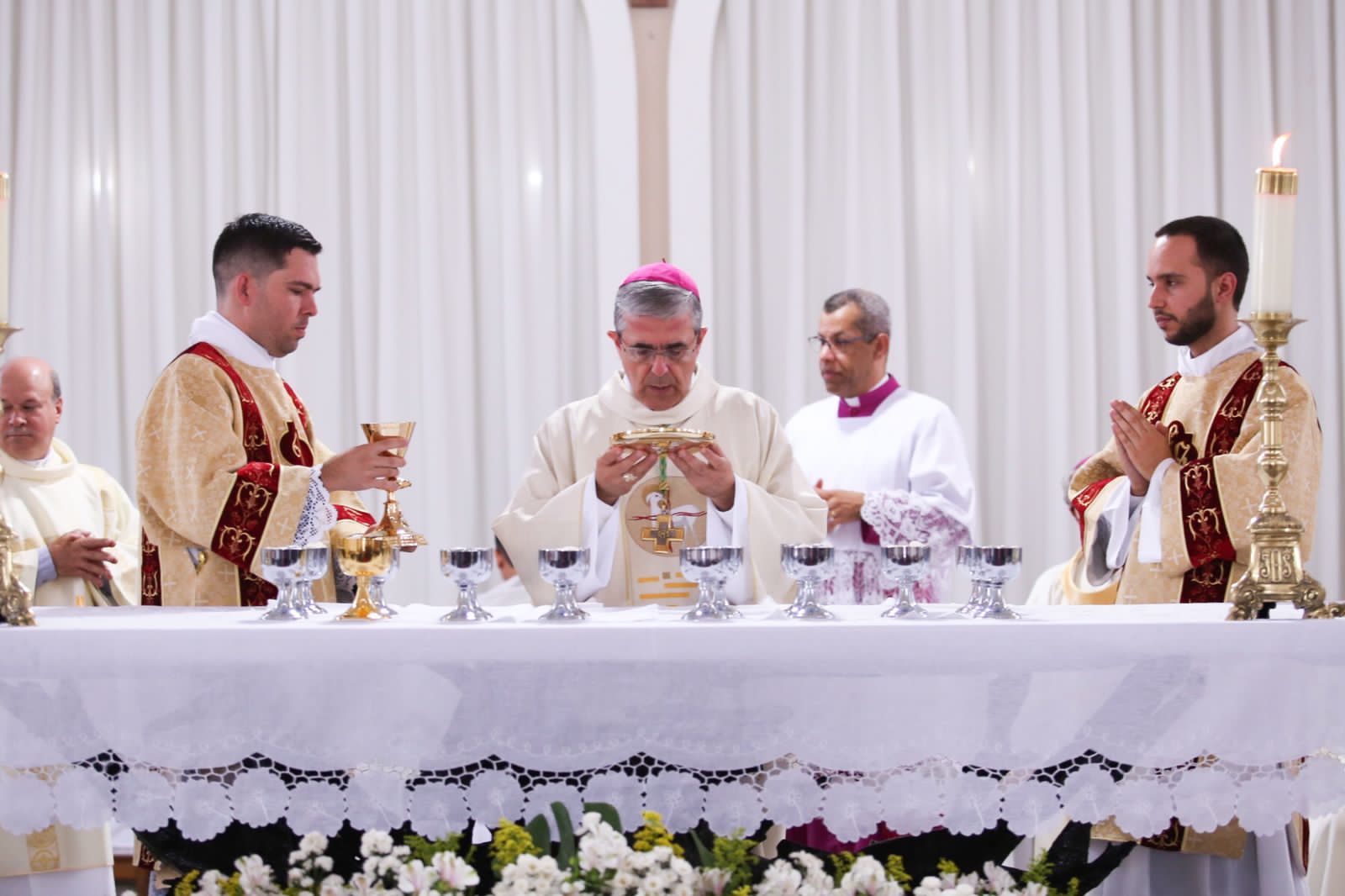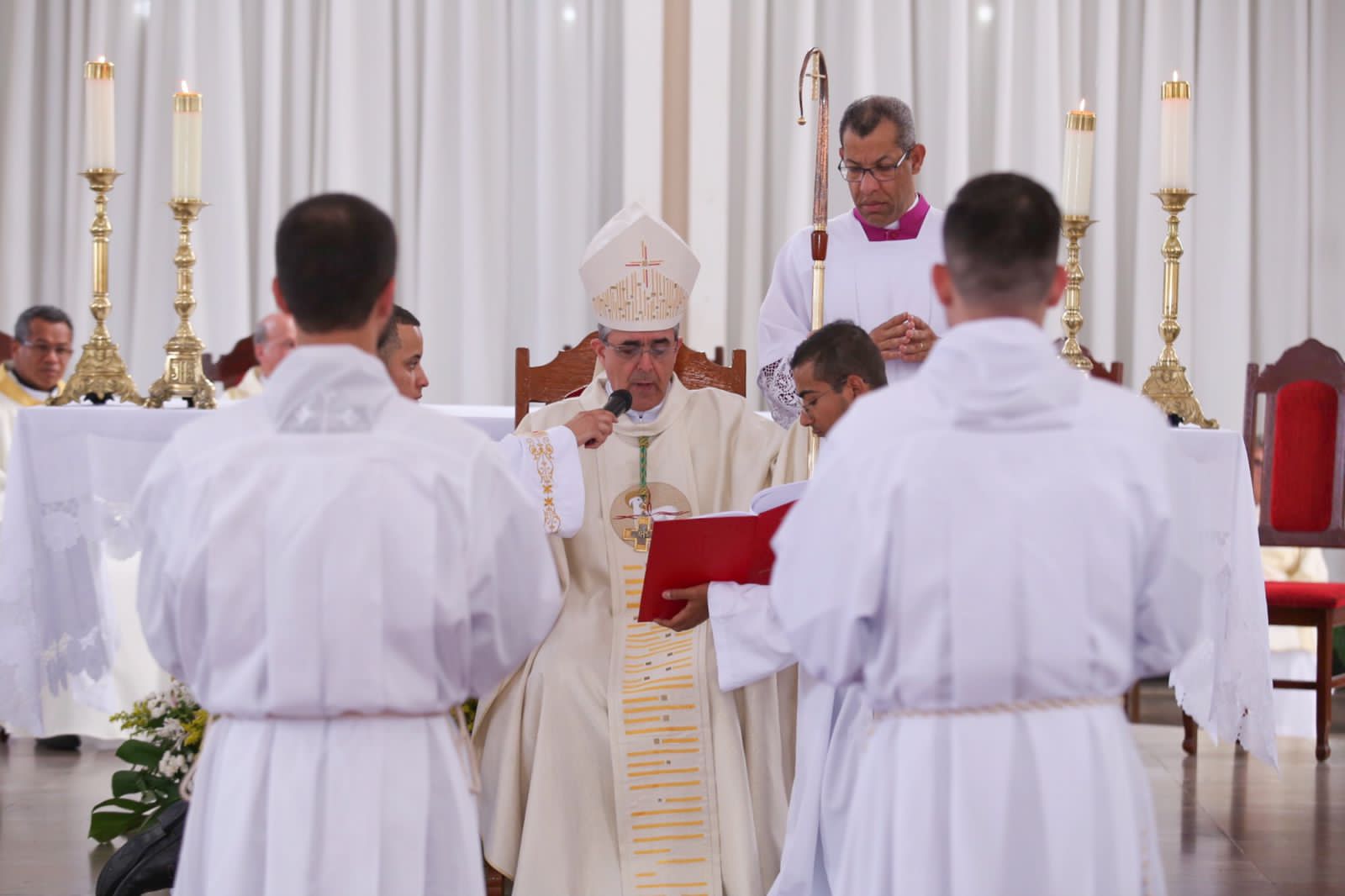 Realizada na Igreja São José, no bairro Timirim, na cidade de Timóteo (MG), a Solene Celebração Eucarística foi presidida pelo nosso Bispo Diocesano, Dom Marco Aurélio Gubiotti, concelebrada por presbíteros do Clero de nossa Diocese, e contou também com a presença de familiares dos ordinandos.