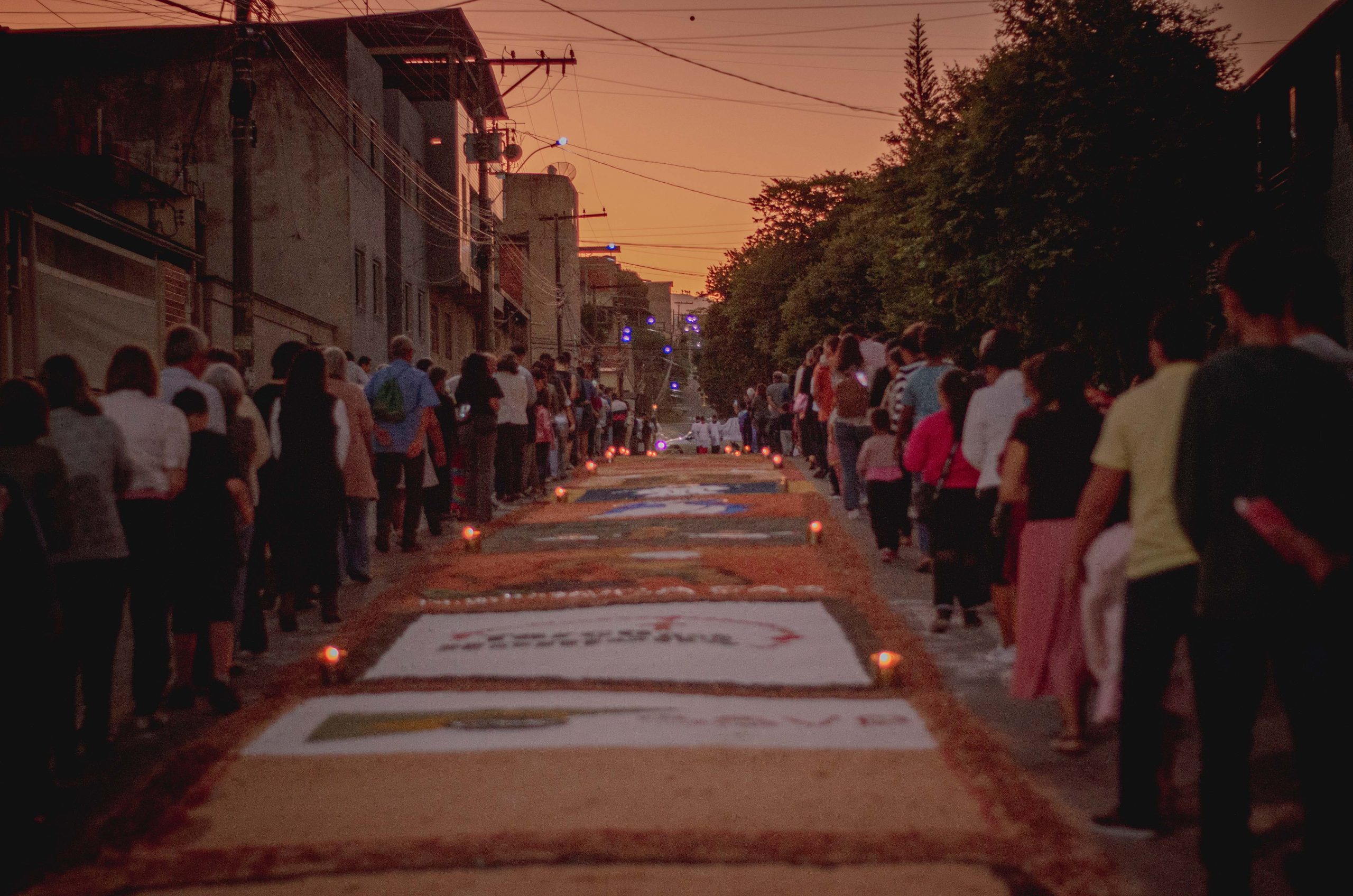 Após dois anos sem os tradicionais tapetes de Corpus Christi, por conta da questão sanitária da pandemia da covid-19, neste ano, retornamos com a confecção dos belíssimos tapetes, que foram confeccionados no perído da manhã pelos membros das pastorais, movimentos e serviços de nossa paróquia.